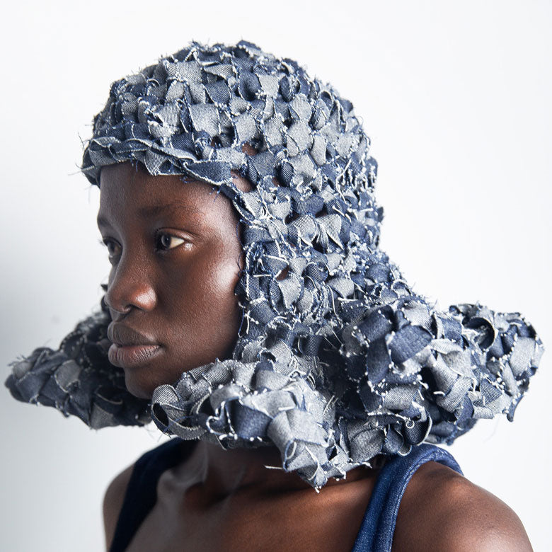 Handmade crochet wig-hat in dead stock blue denim