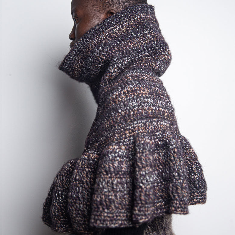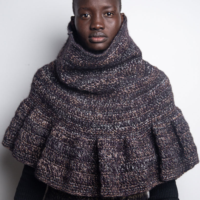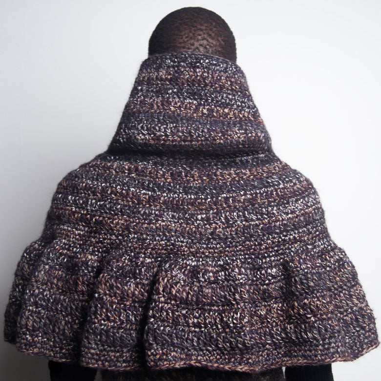 Handmade crochet neck cape in brown dead stock wool yarn.
