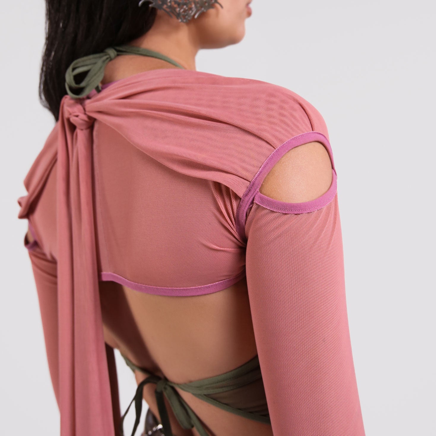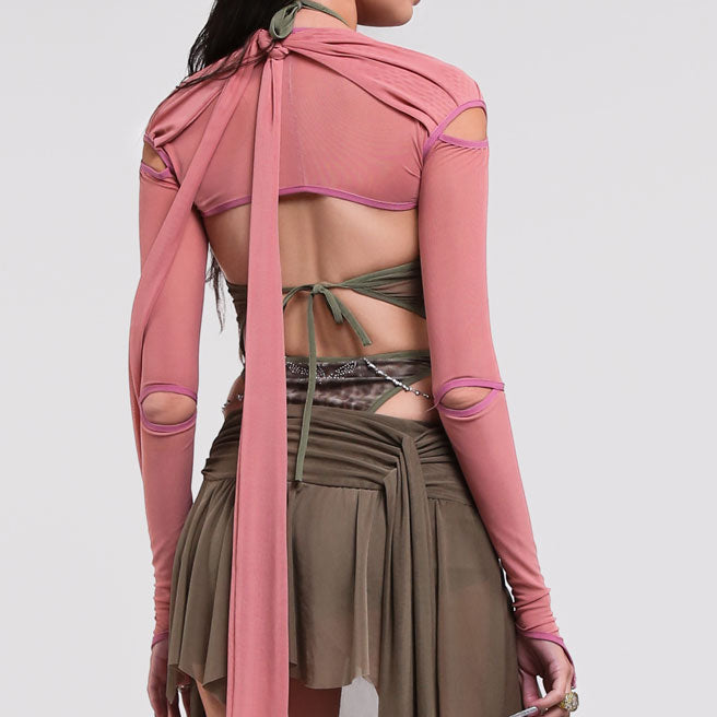 Peach Cut Out Mesh Bolero Sleeves With Back Tie