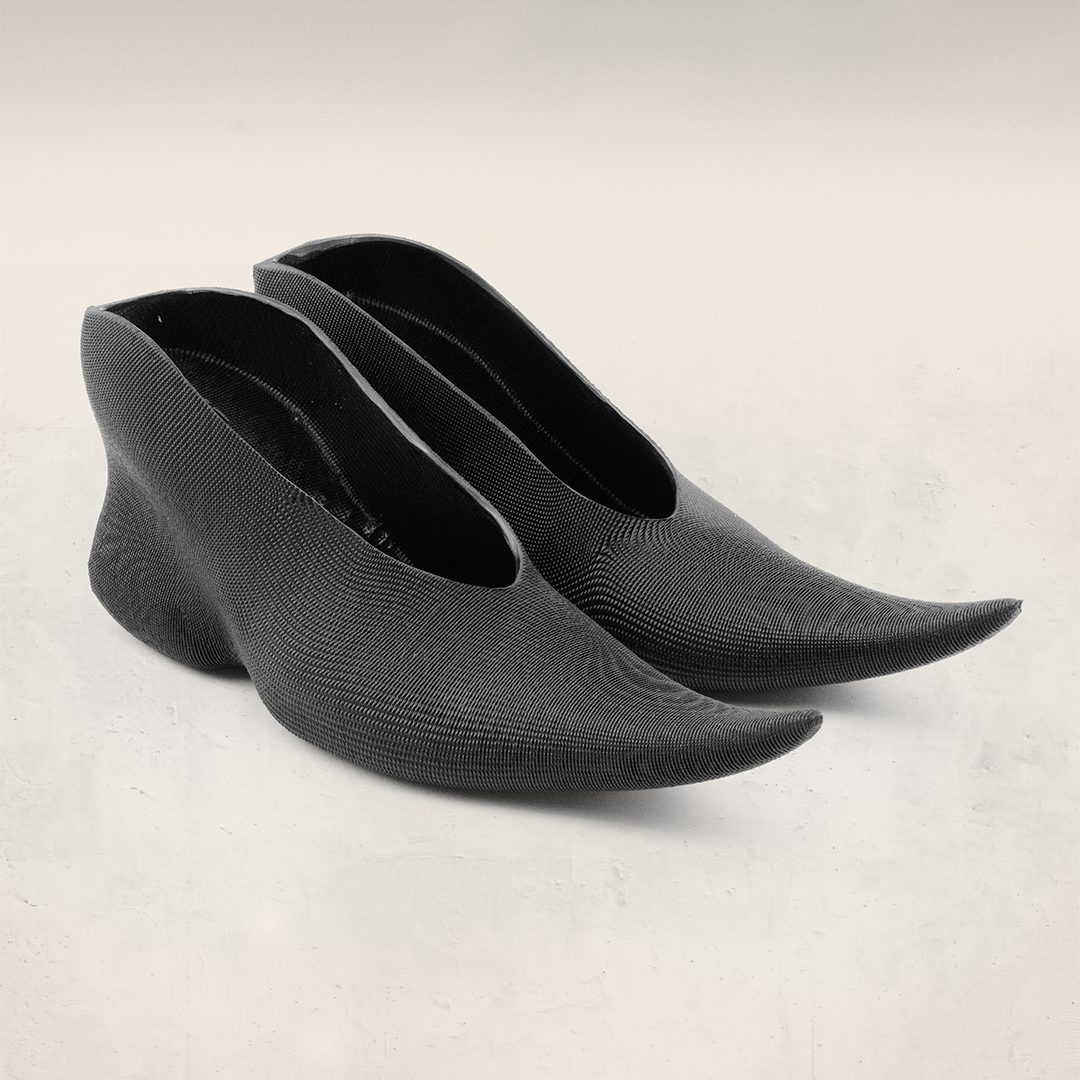 3D-printed rubber heels. These heels are crafted entirely from a fully recyclable, highly flexible polyurethane rubber. Compared to traditional injection molding, 3D printing minimizes material waste while maintaining structural integrity. Minor surface imperfections are inherent to the printing process and contribute to the product’s aesthetic without affecting functionality.