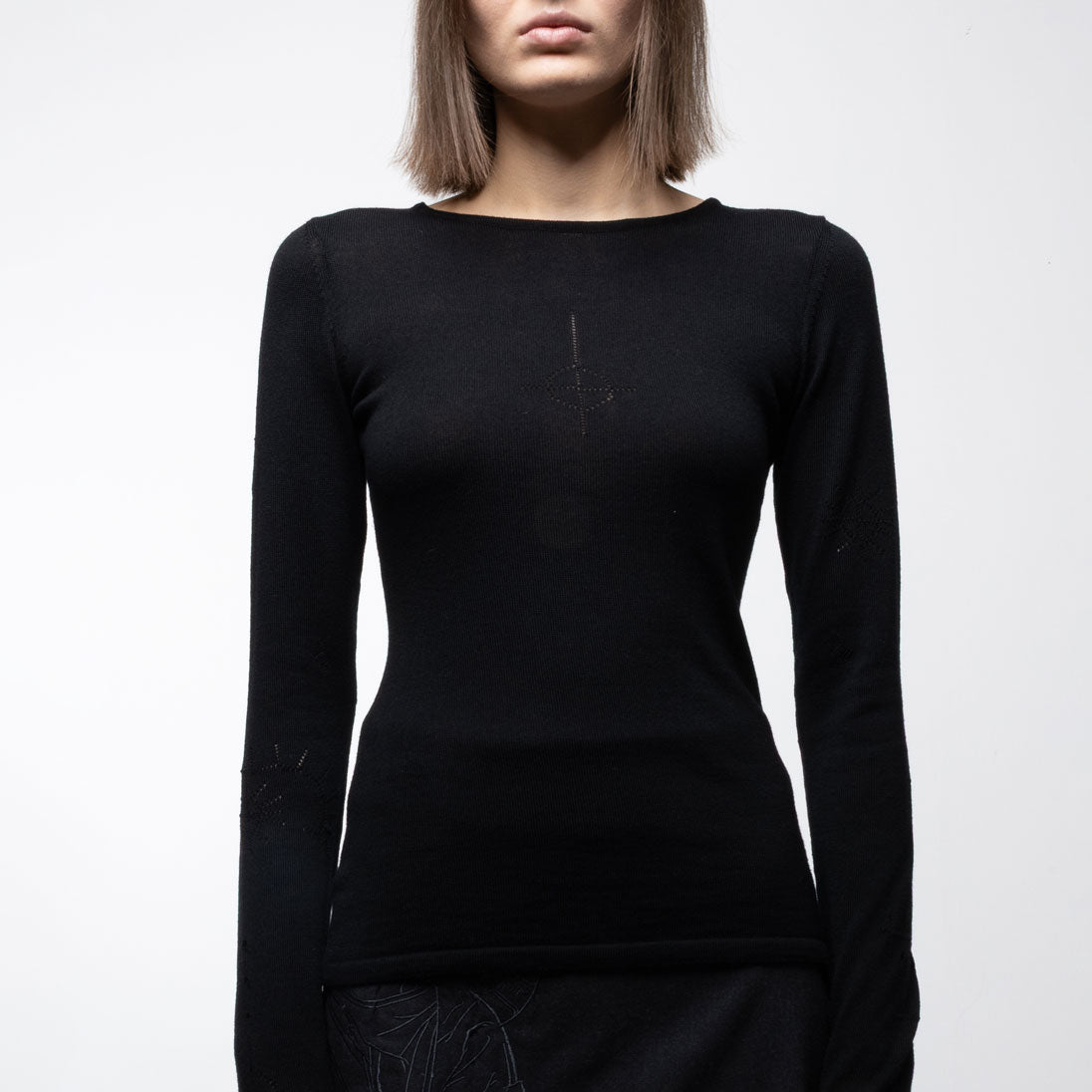 The knitted pullover draw from modern interpretations of Balkan folklore and historical tattoo symbols from Croatia. During the Ottoman period, women marked themselves with these motifs as a form of protection and faith. Reimagined through hole-like knitting, the symbols retain their mythological meaning turning the garment into a protective layer rooted in memory and resilience.