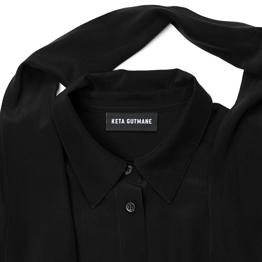 Silk crepe blouse featuring an integrated scarf and attached bodysuit base to ensure a perfectly sleek fit — never slipping out of skirts or trousers.