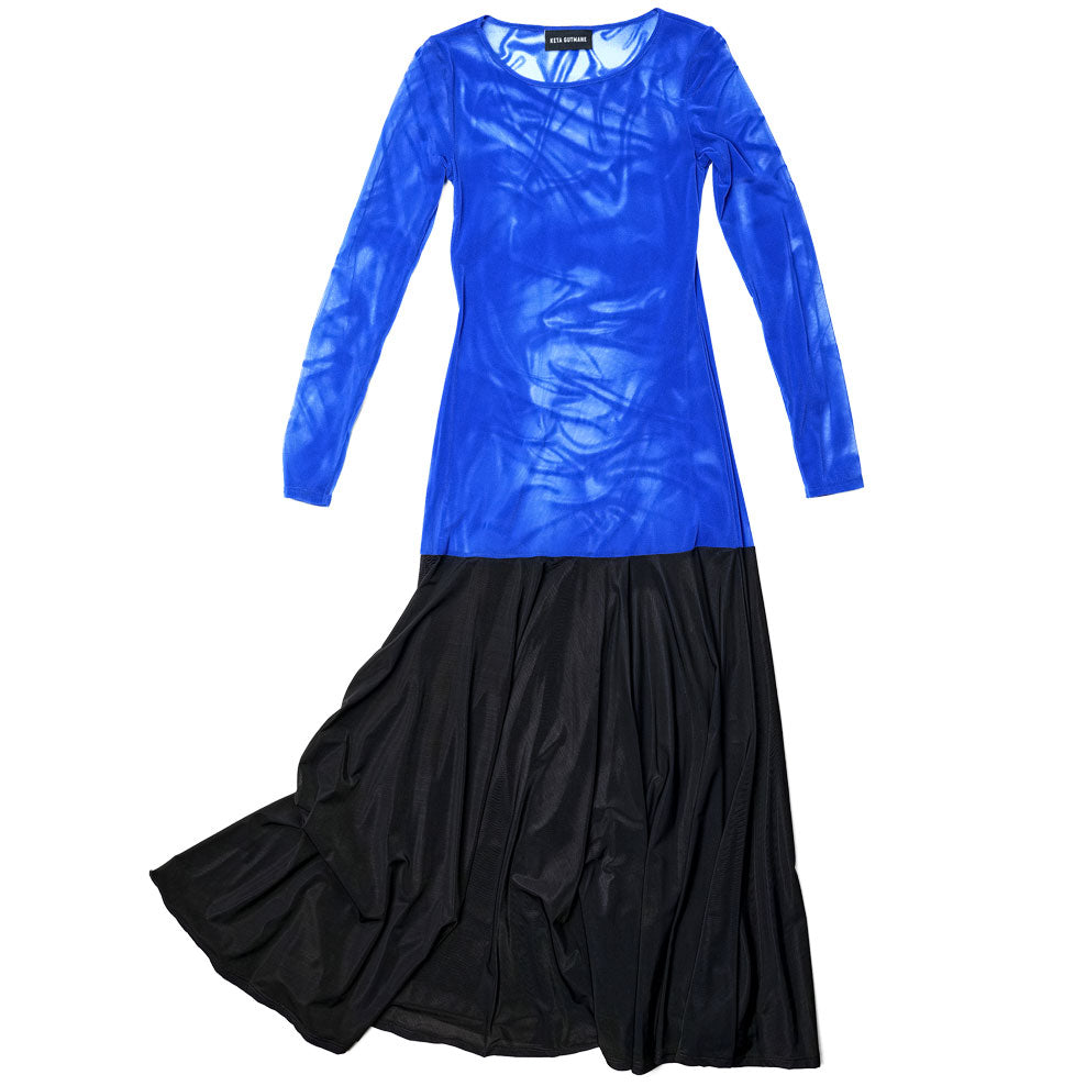 A fluid maxi dress in sheer mesh, elevated with custom artwork and bold graphic detailing that channels the brand’s signature wet-look aesthetic, designed to layer seamlessly with a tonal or contrasting bodysuit.