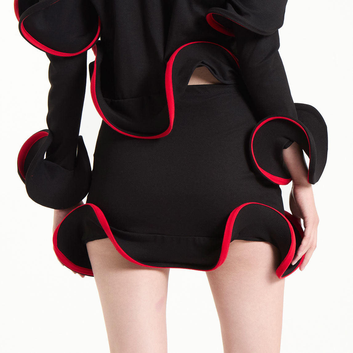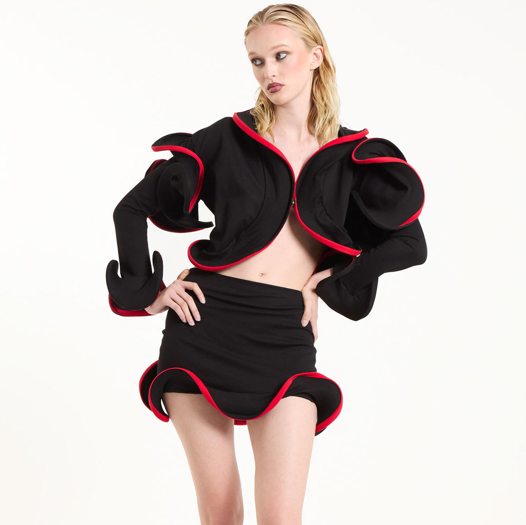 The Camilla Jacket is a structured black viscose jersey piece with distinctive petal details on the shoulders, sleeves, and collar. It features a magnetic closure for easy wear.
