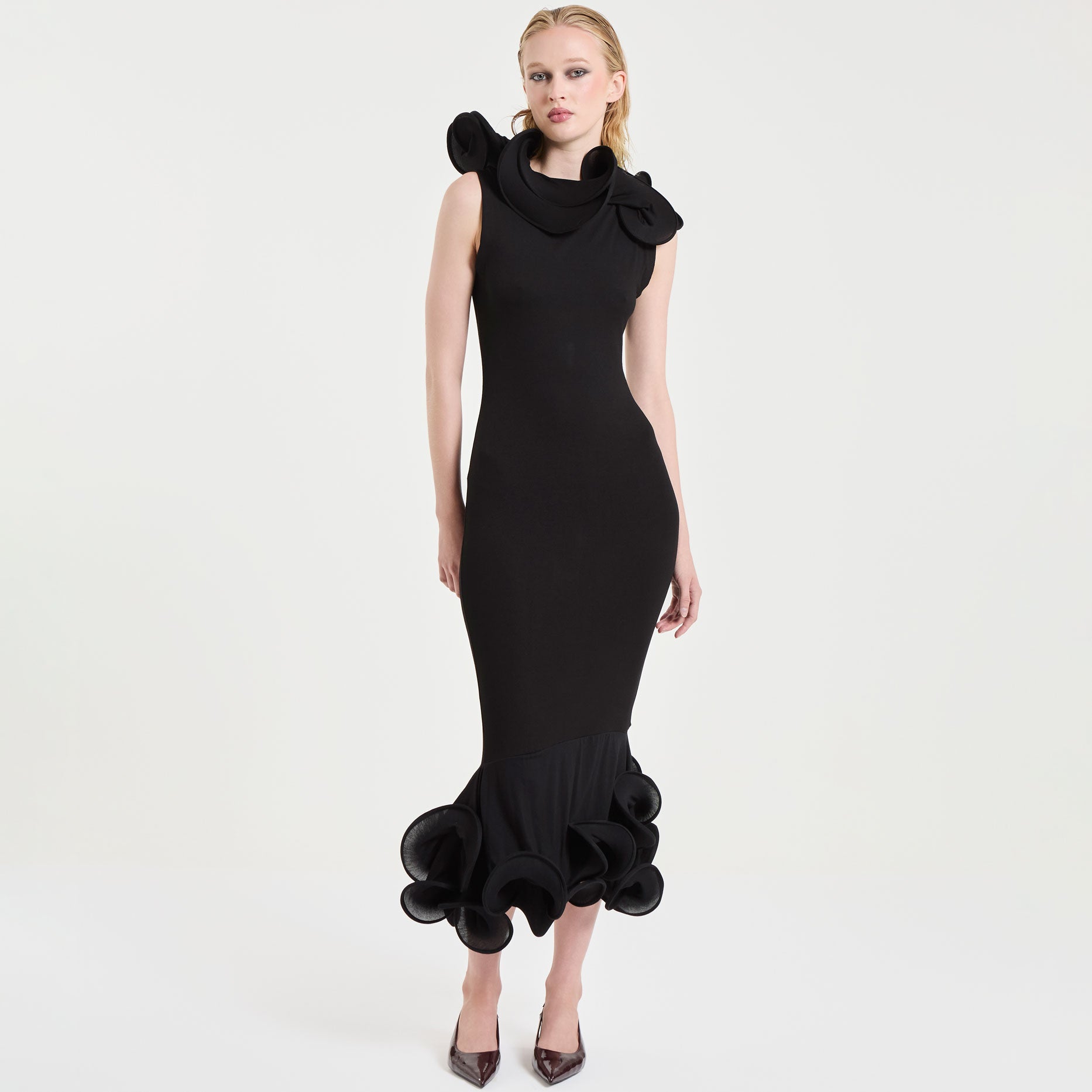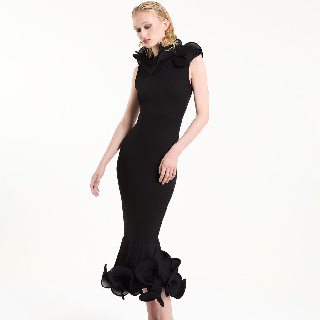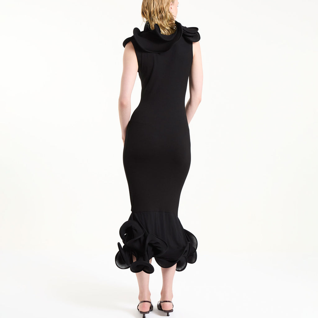 The Morticia dress is a sculptural dress made out of black viscose jersey. Featuring the brand’s signature volumetric forms, it has double petal-like detailing at the hem and neckline.