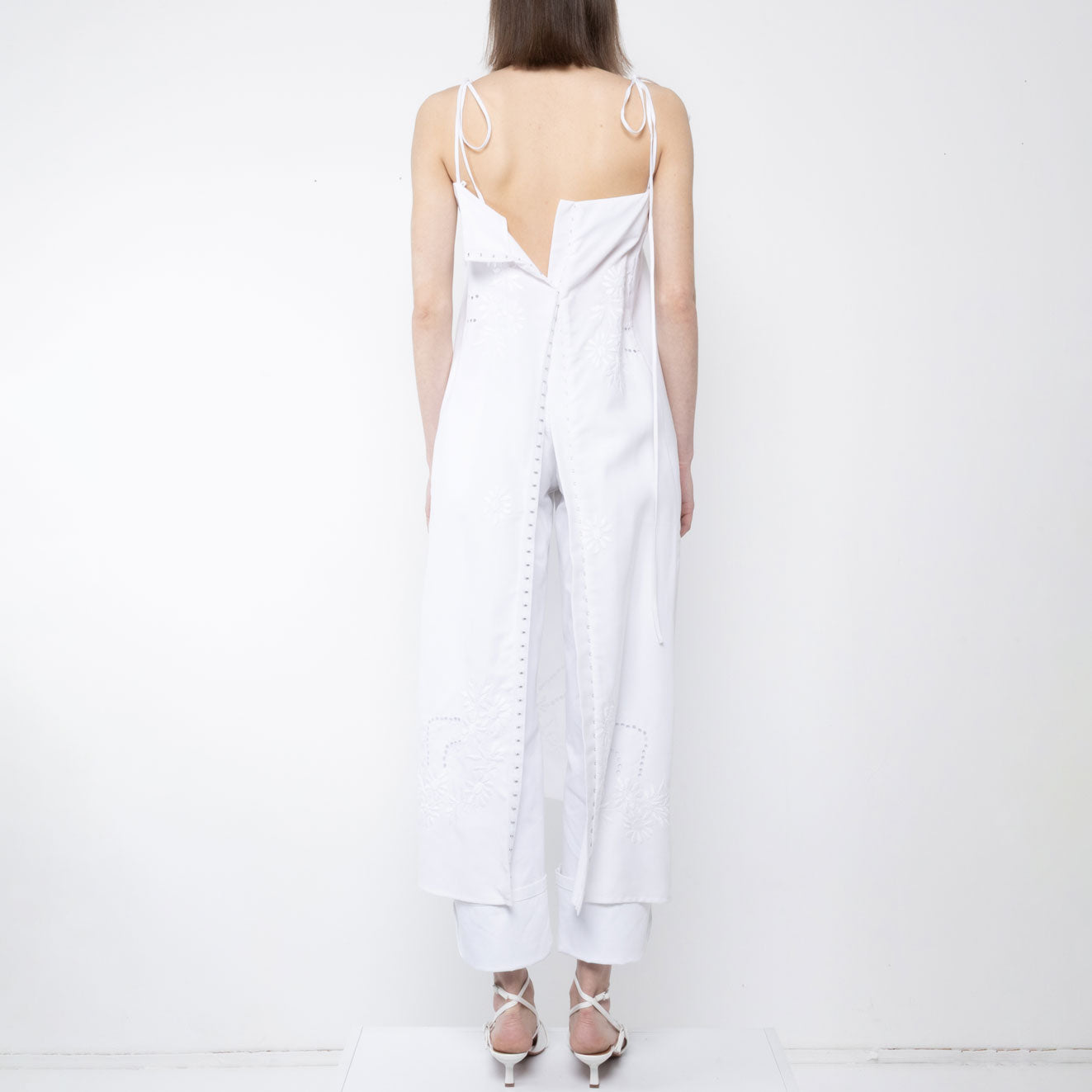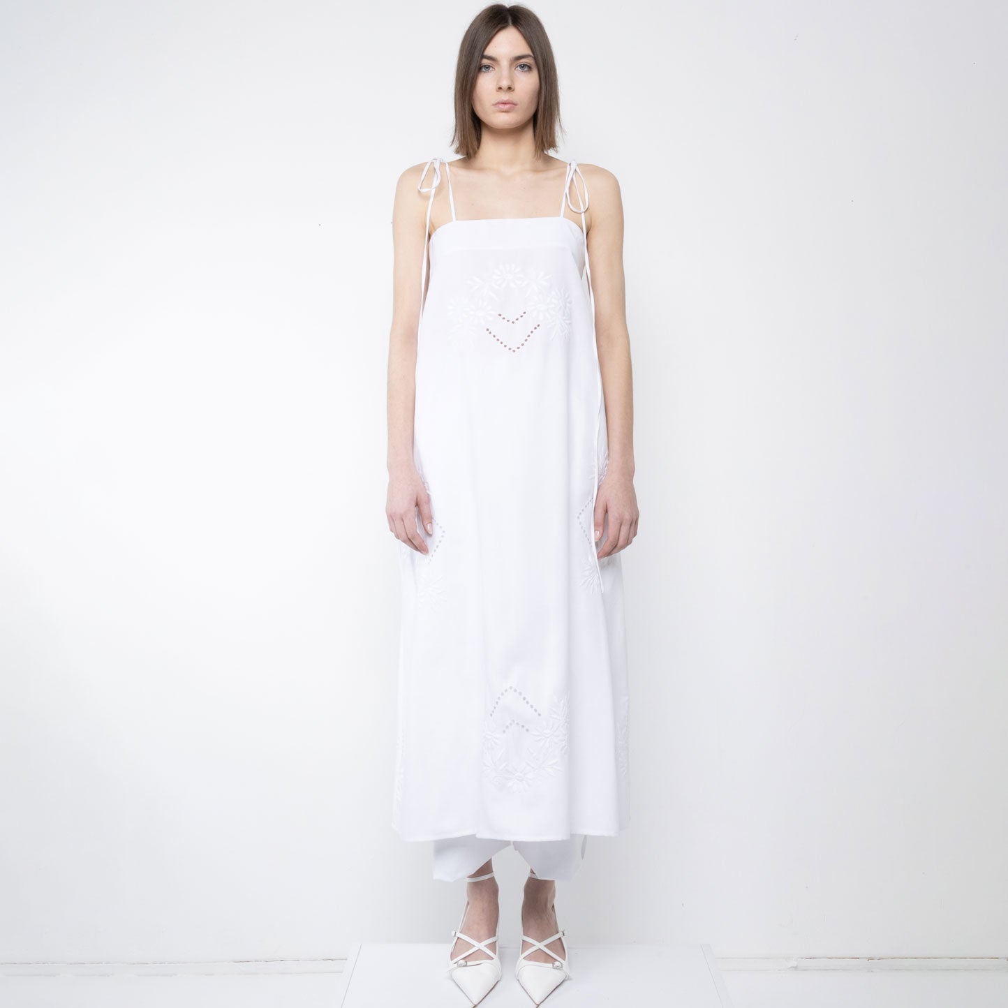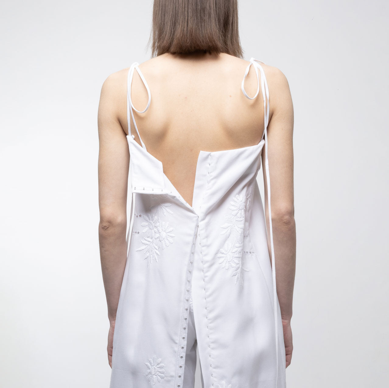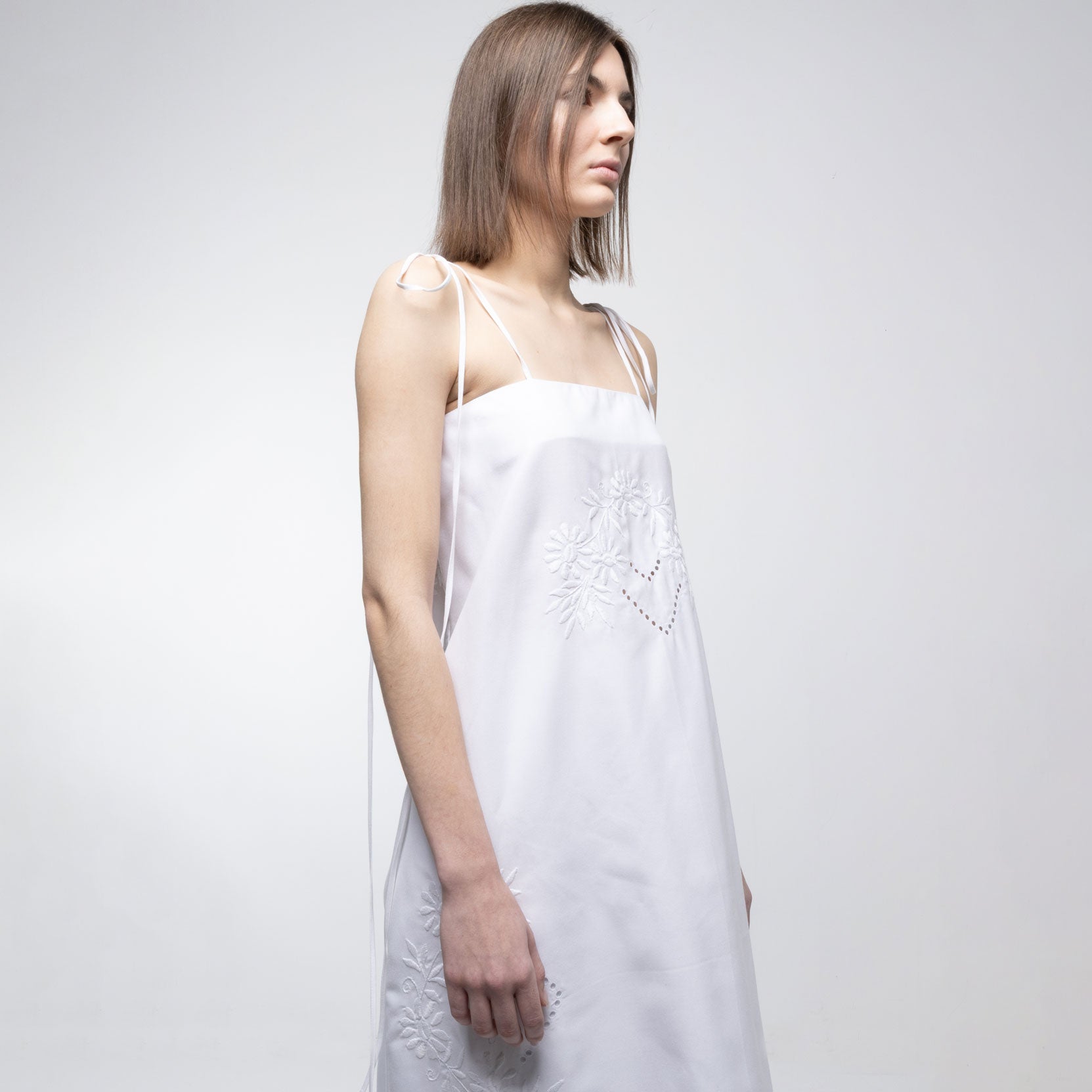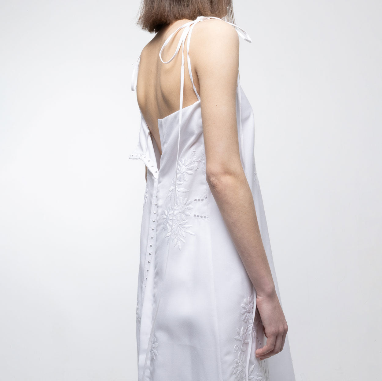 The dress features two shoulder straps that can be tied in different ways. Two loops on both sides that can be used to tie the shoulder straps. The dress can be worn open at the back or closed with a button. One button at the top of the dress and one on the waistline. Created out of a 60 year old embroidered tablecloth. The fold lines of the tablecloth can still be seen on the dress from being folded for so many years. The embroidery was handmade, making it uneven and unique.
