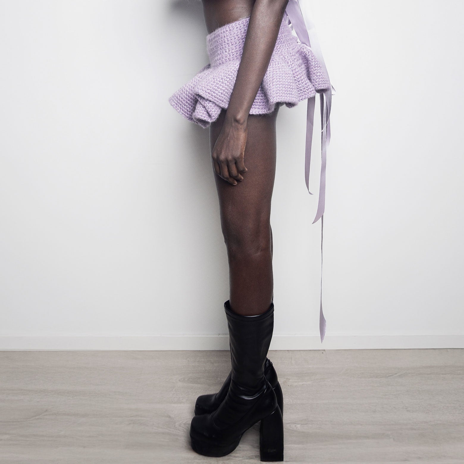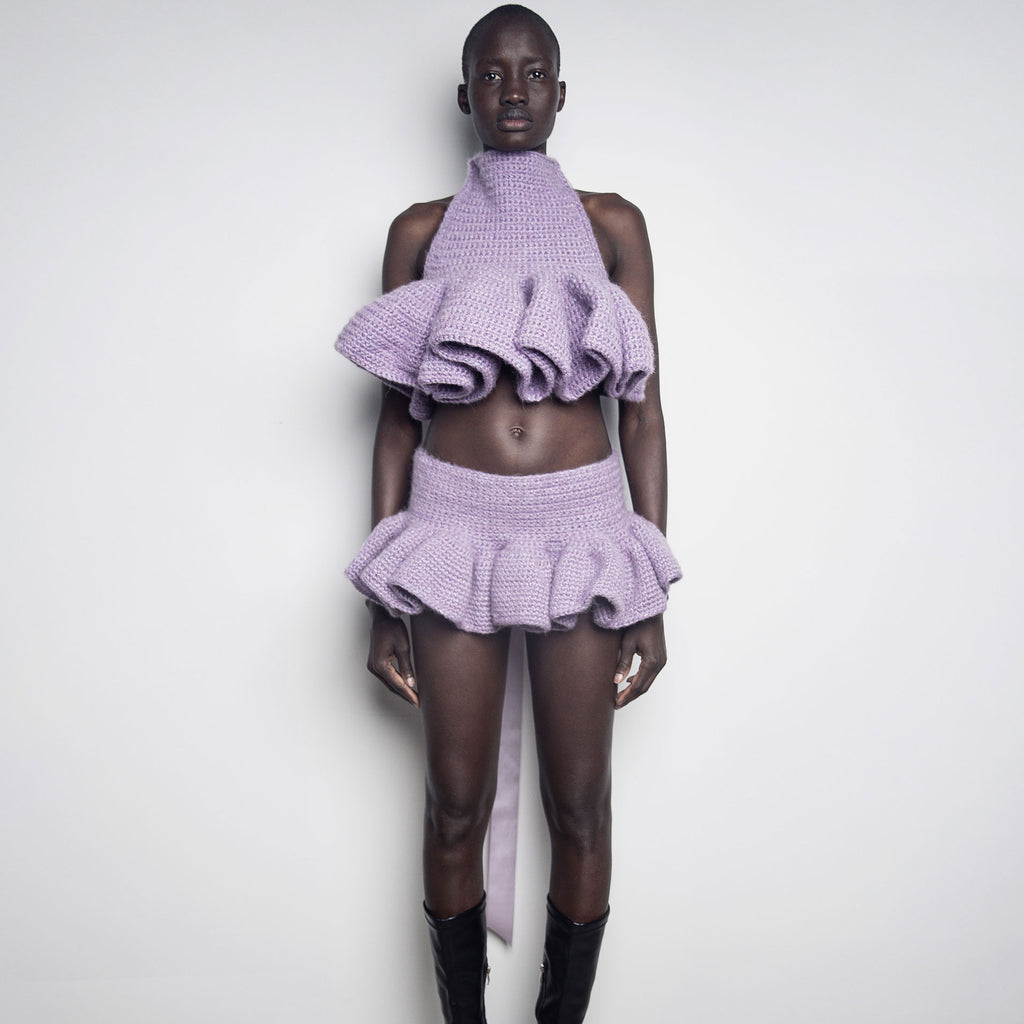 Handmade crochet skirt in lavender dead stock wool yarn.
