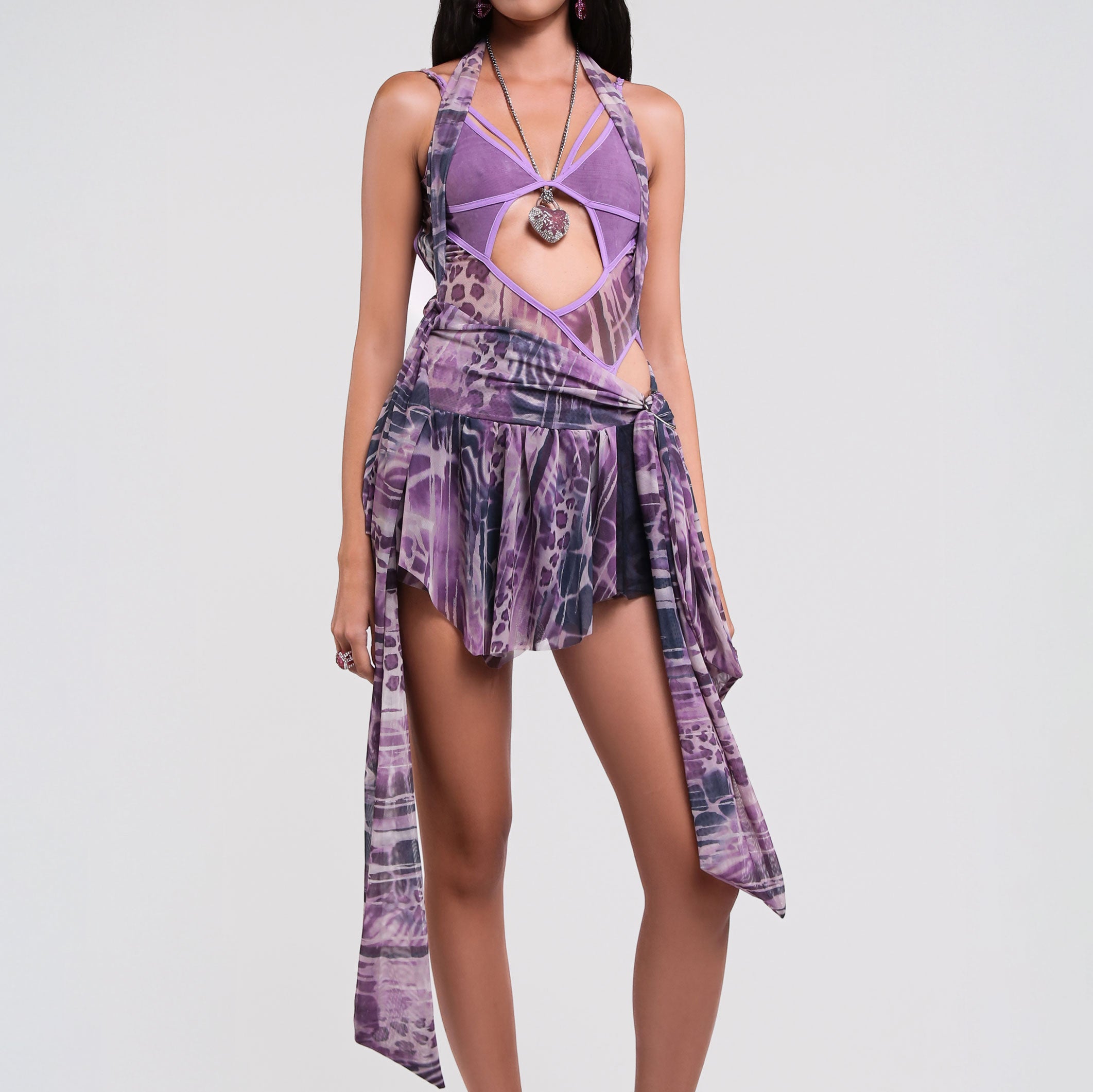 Purple and animal print mini dress with strategic cut-outs and a fitted silhouette. The patchwork design combines mesh panels with bold patterns for a statement piece that balances playful femininity with contemporary edge. Includes a belt for versatile styling options.