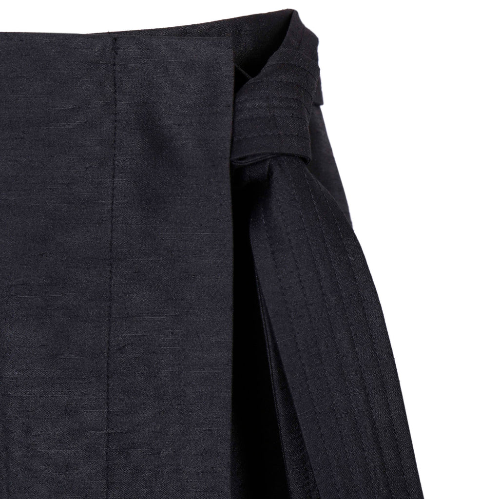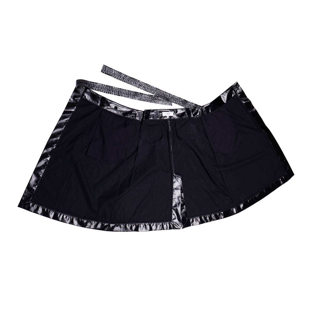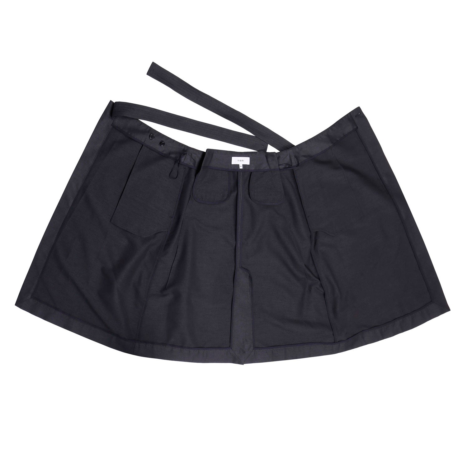 The asymmetric cut and layered contrast panel add visual depth, while the adjustable snap-button waist offers a customizable fit. Finished with elongated wrap ties and a subtle A-line shape for fluid movement and modern edge.