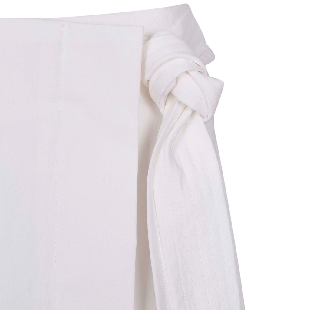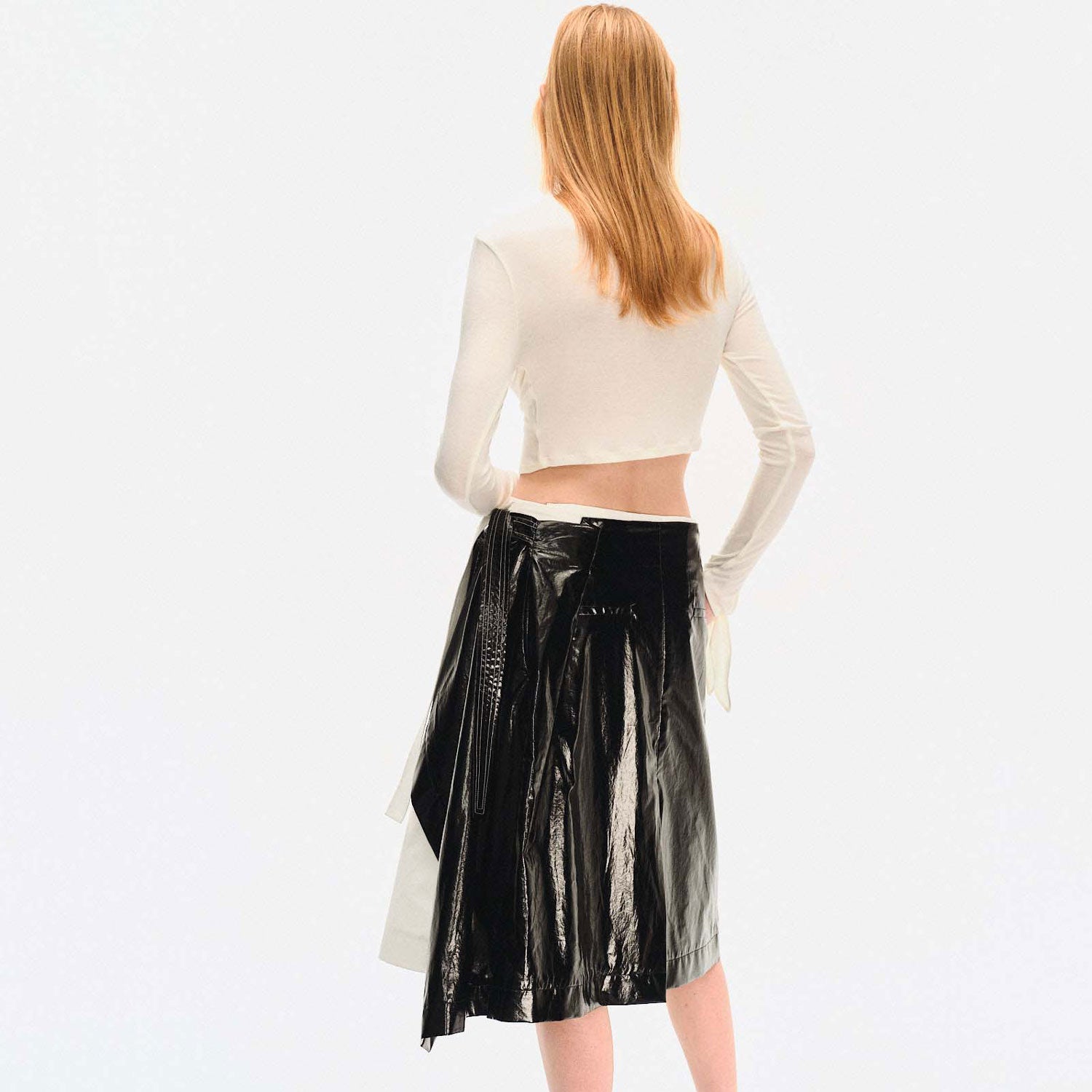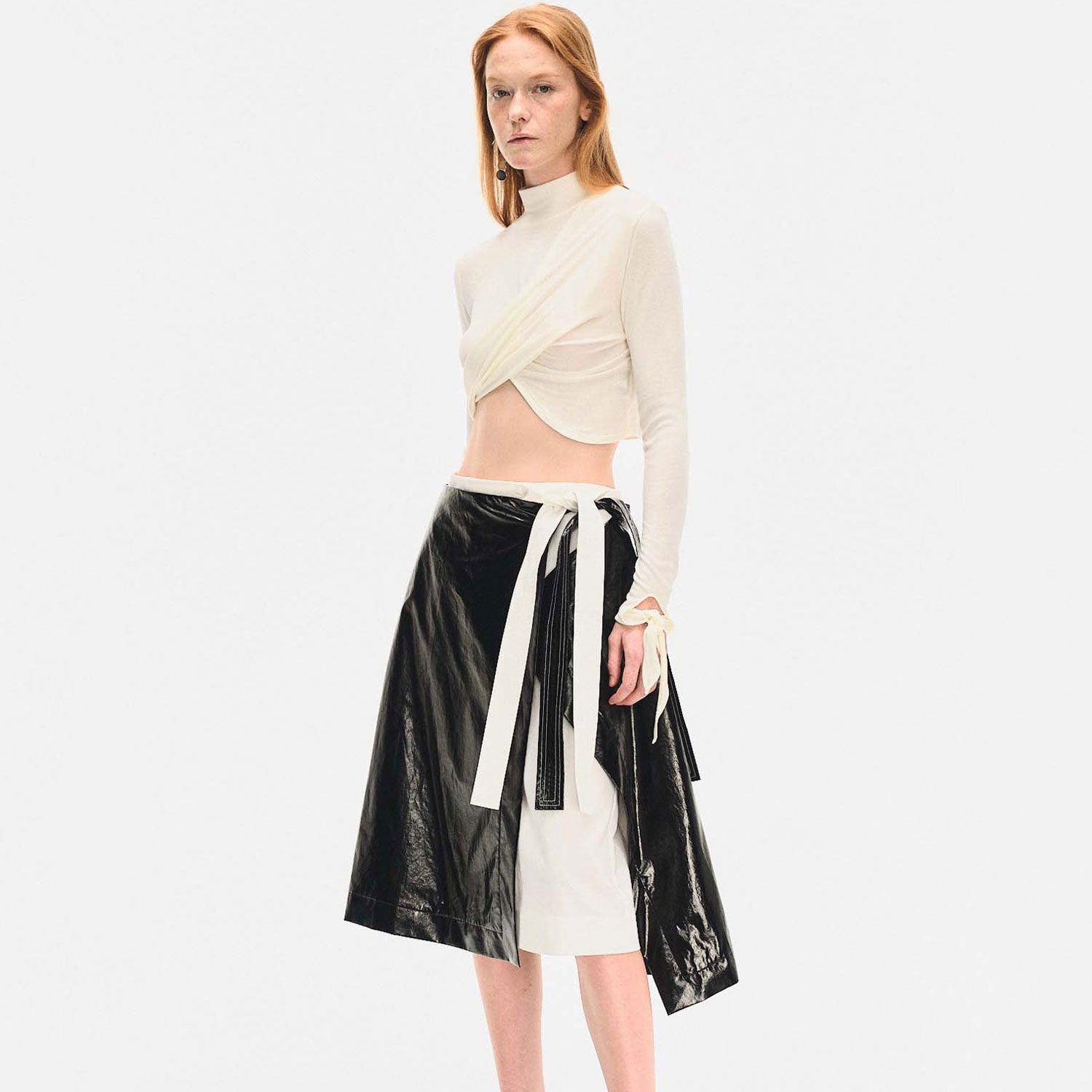 The asymmetric cut and layered contrast panel add visual depth, while the adjustable snap-button waist offers a customizable fit. Finished with elongated wrap ties and a subtle A-line shape for fluid movement and modern edge.