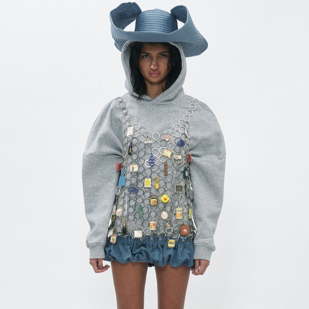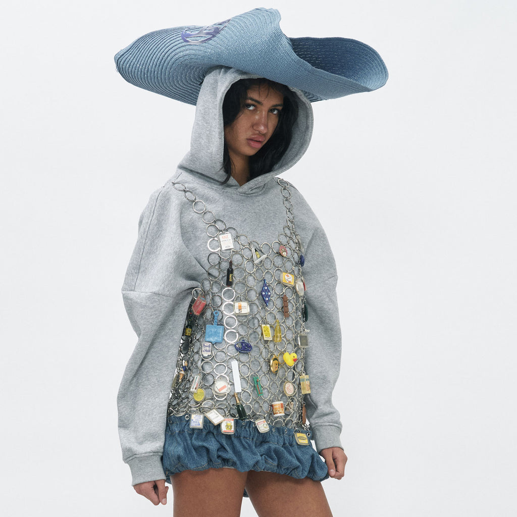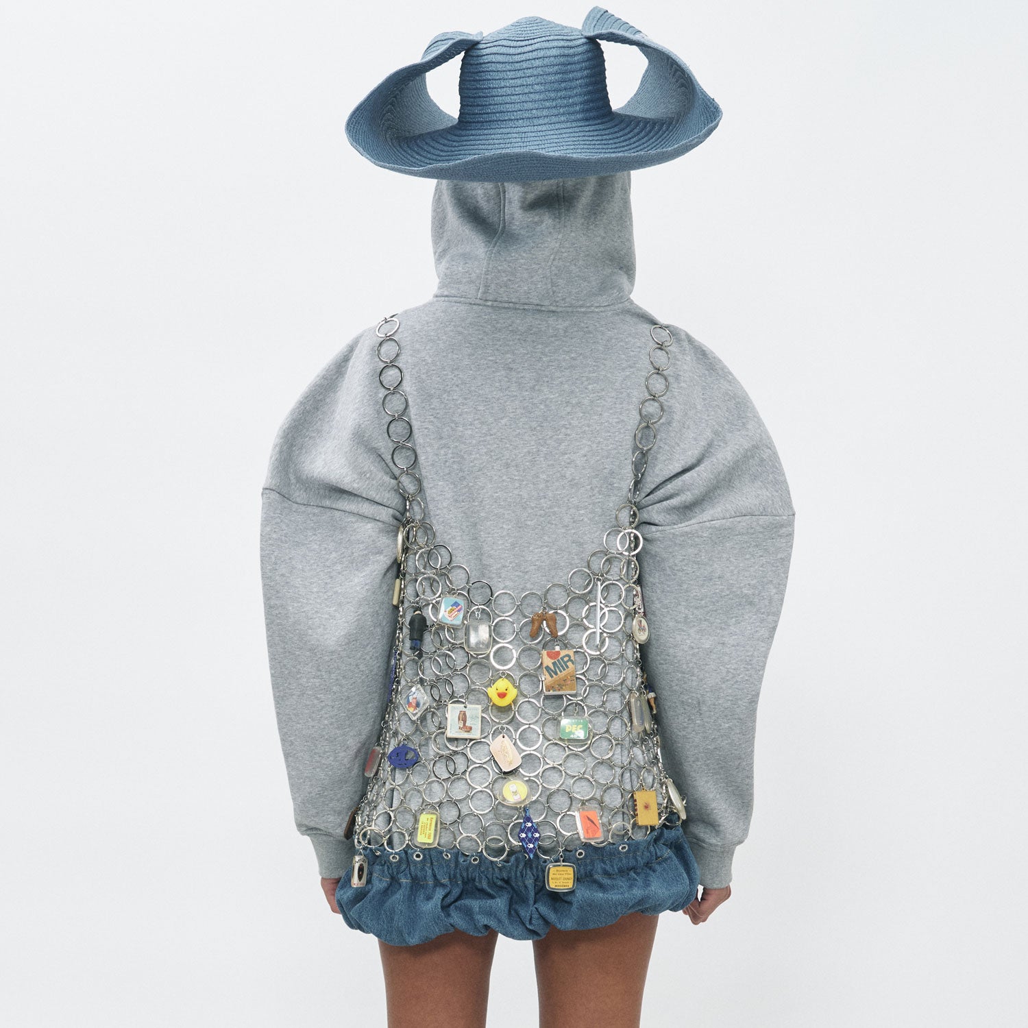 Dress made of vintage keychains and elasticated ruffled skirt part of denim.