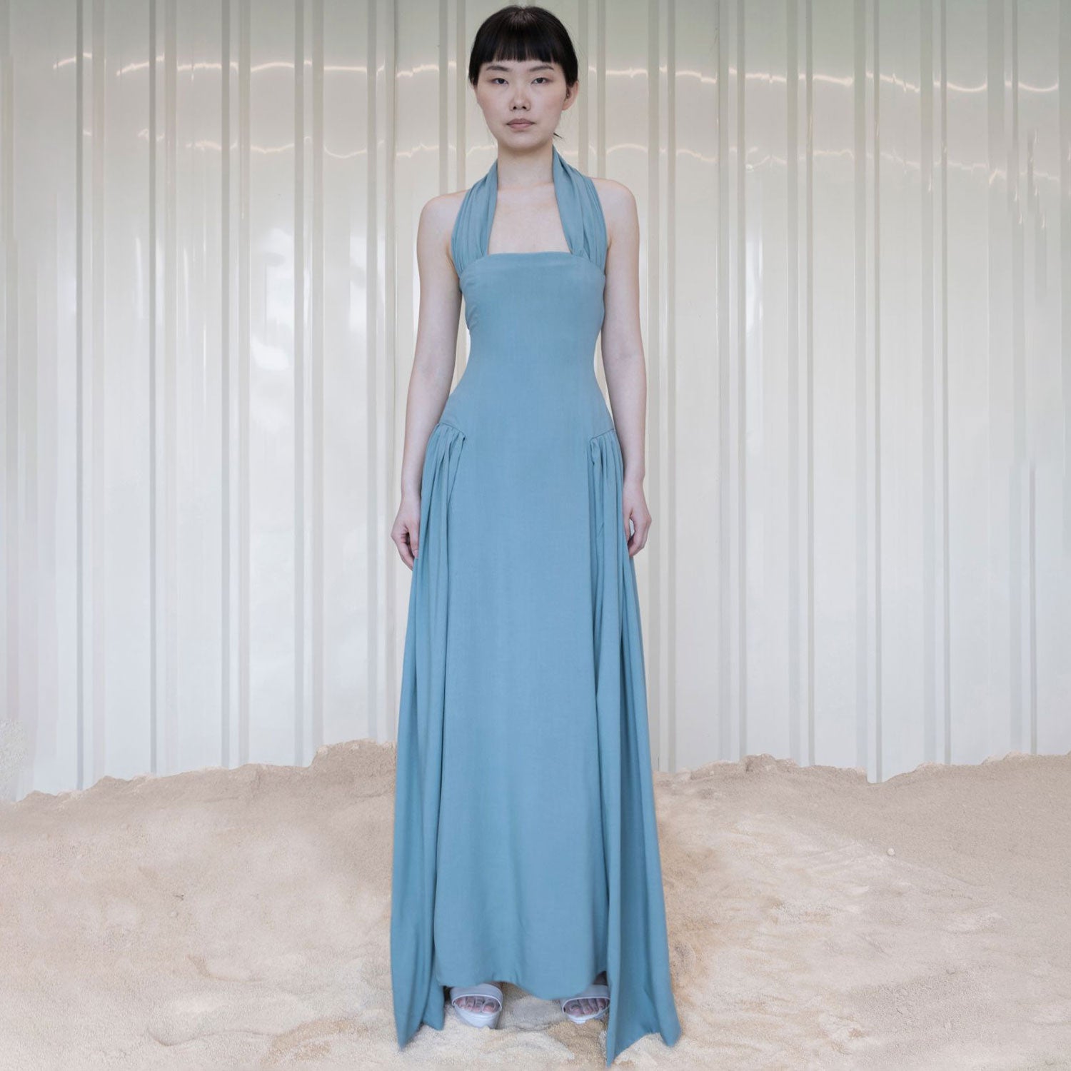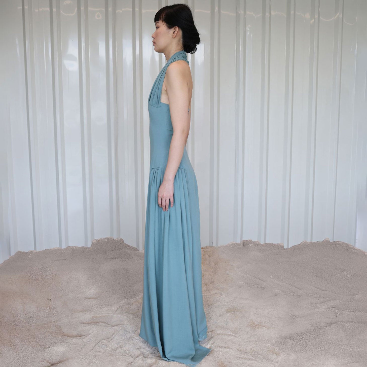 Description: Long sleeveless dress with accent fabric textures on shoulders and on sides