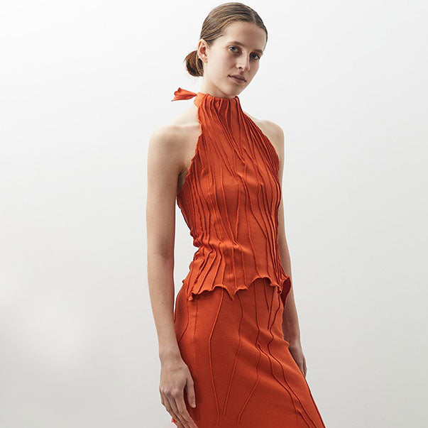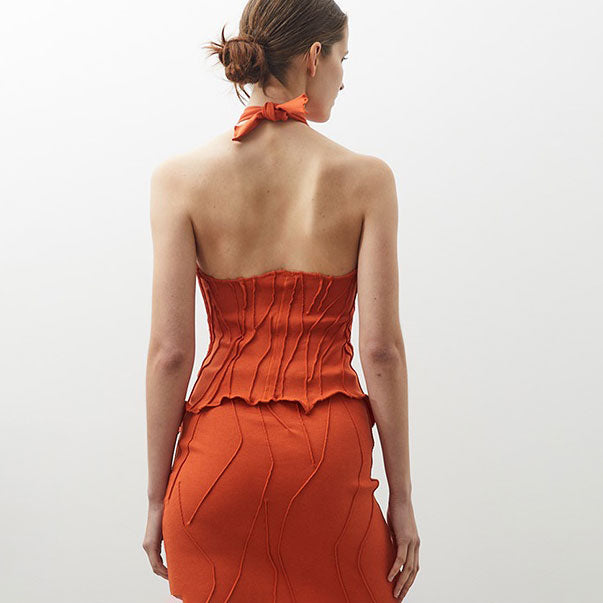 Fitted halter top with adjustable strap at the neck. Open back and asymmetric scraps
