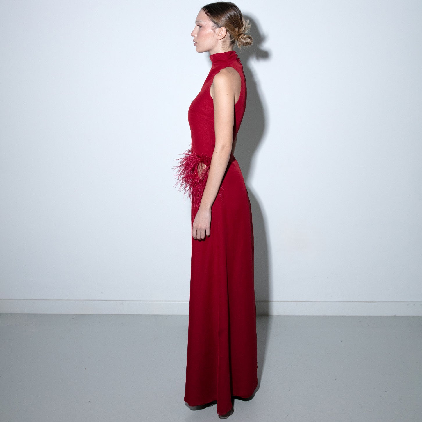 Description: High neck long dress made of cherry red chiffon fabric and crepe lining featuring round cutouts and feathers detail.