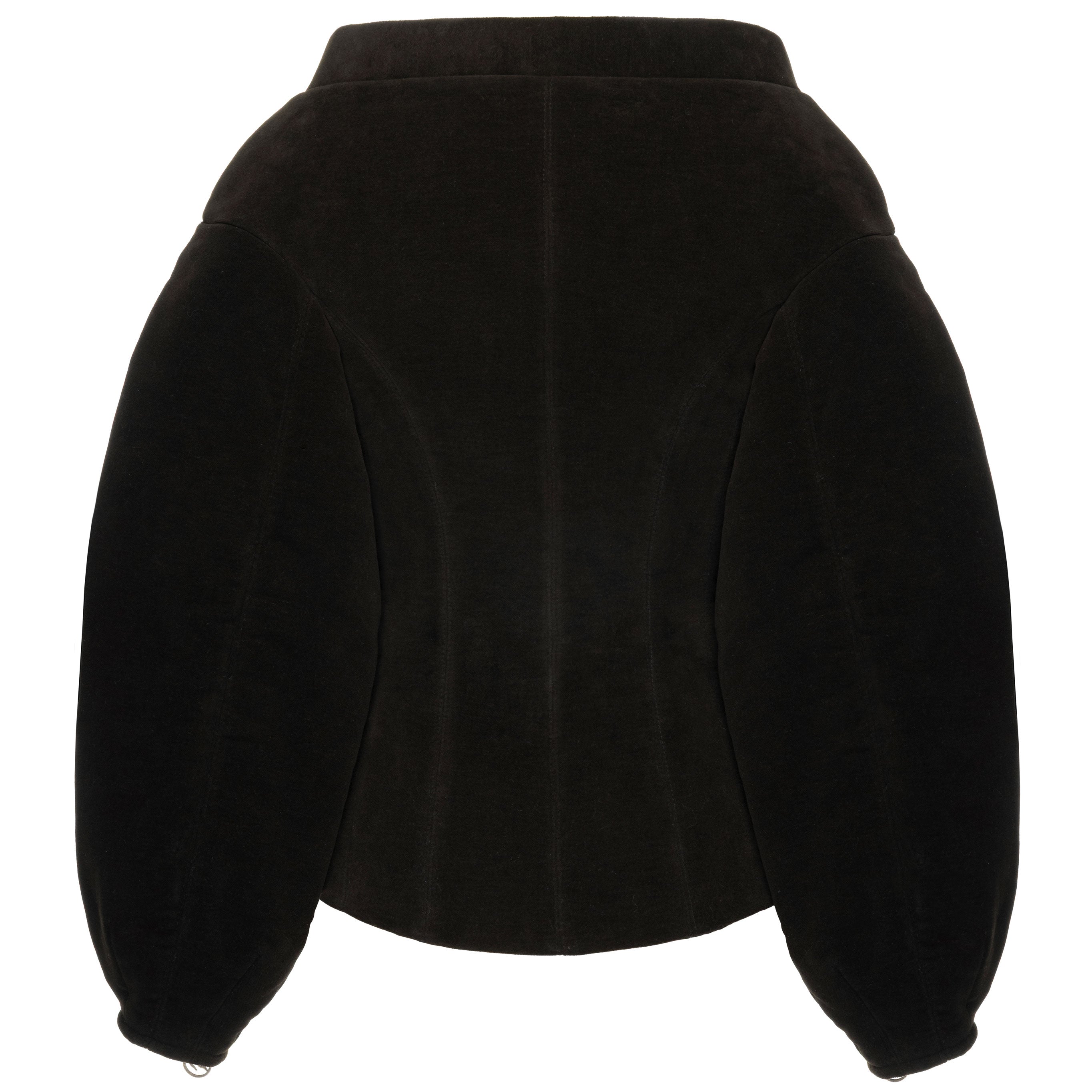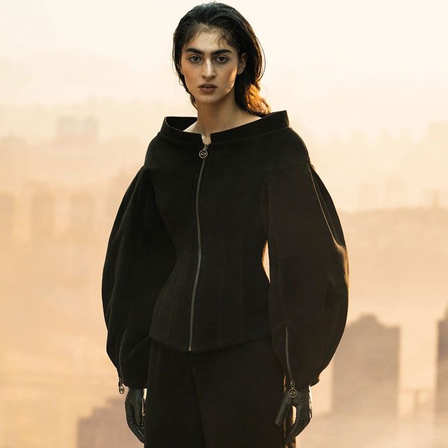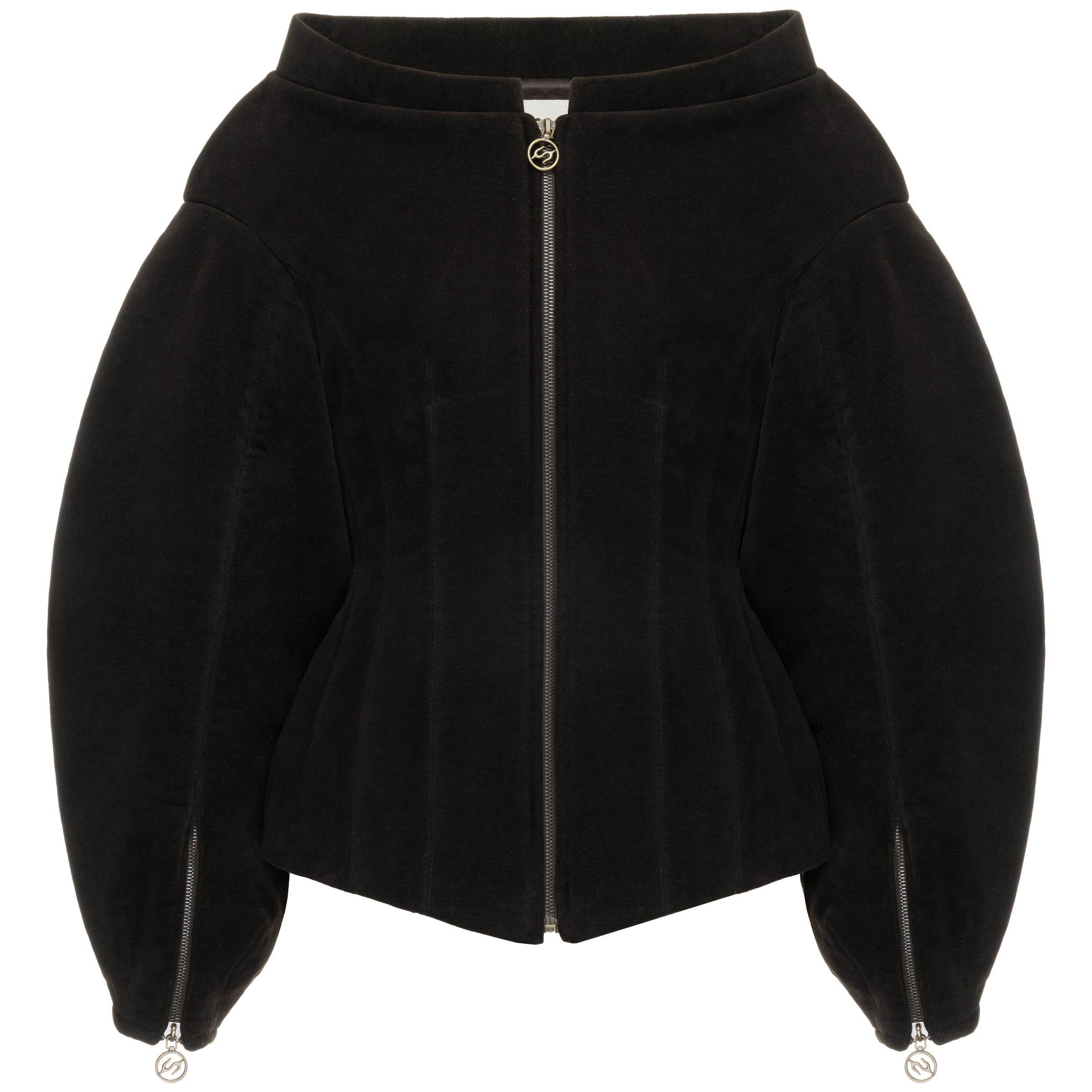 Soft velour meets architectural lines in this jacket, where a corset-inspired fit contrasts with voluminous sleeves. The piece embodies the collection’s spirit- a harmony of texture and form, organic richness shaped into confident, expressive modernity.