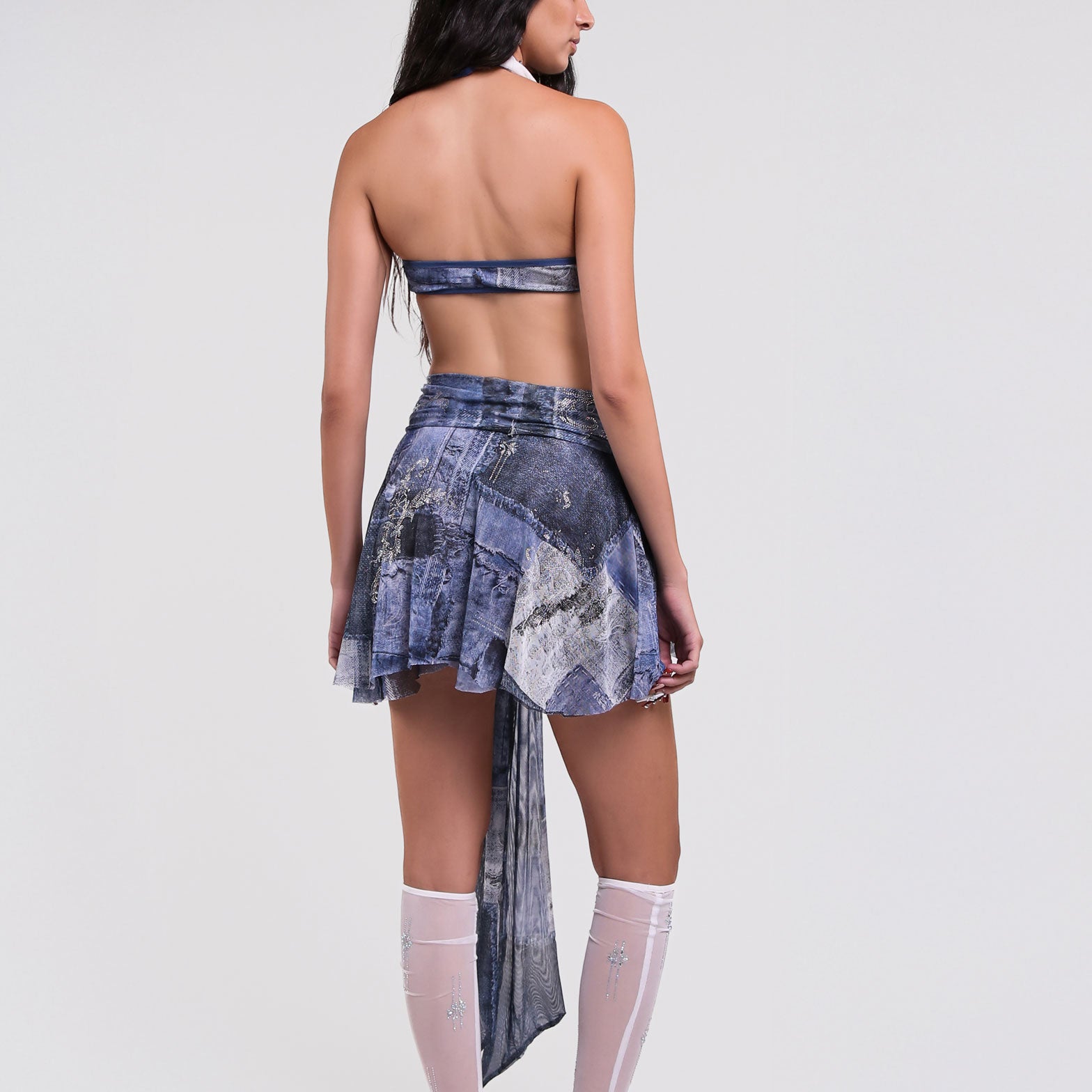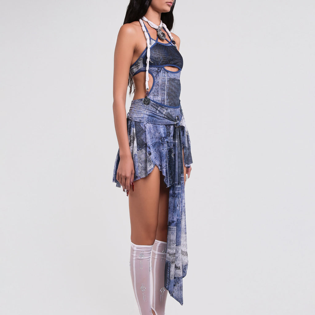 Denim Printed Mesh Asymmetric Mini Dress With Cut Outs