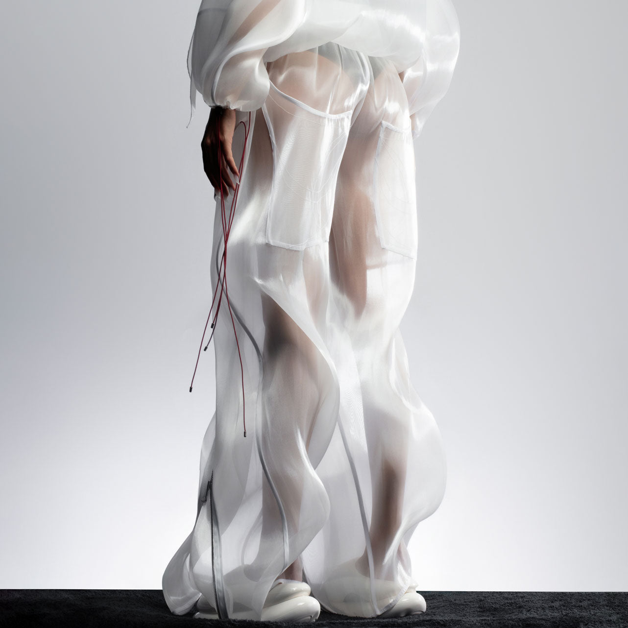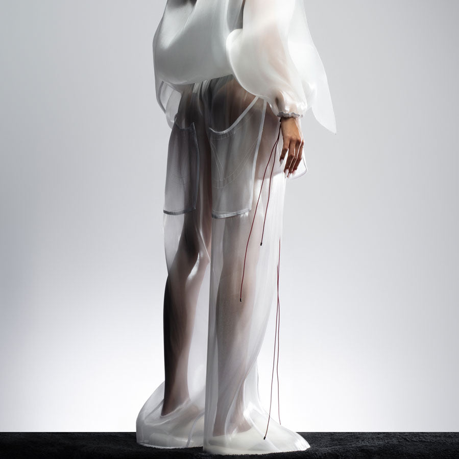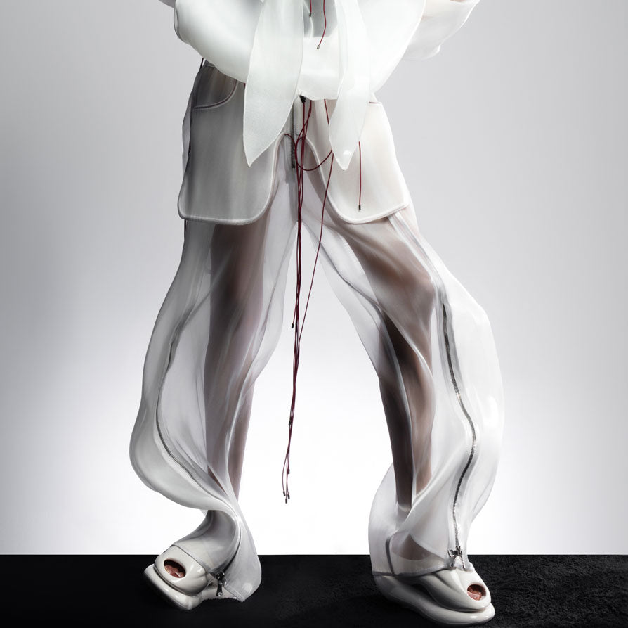 Bottom front organza inserts with visible gunmetal zippers for versatile styling