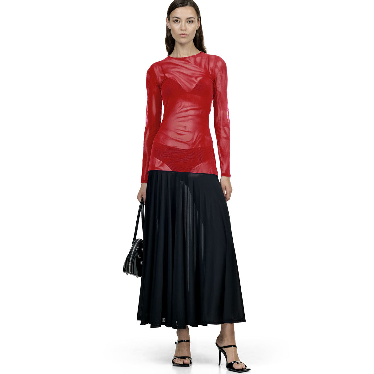 A fluid maxi dress in sheer mesh, elevated with custom artwork and bold graphic detailing that channels the brand’s signature wet-look aesthetic, designed to layer seamlessly with a tonal or contrasting bodysuit.
