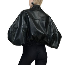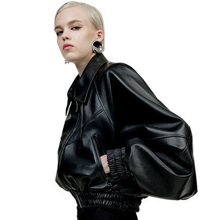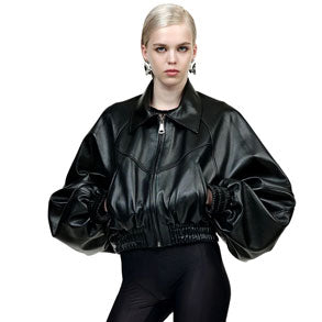Exaggerated rounded volume cropped soft leather jacket. Designed with rounded sleeves, 2 front slash pockets, zipped closure and flat collar.