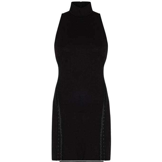 The Untamed jersey mini takes the classic LBD and slices it open with daring double side slits that are each edged with bold hook and eye closures that let you play with the reveal. Cut in a body-skimming silhouette with a high neck and sleeveless finish, it’s the ultimate power move for after-dark moments. Effortless stretch jersey keeps it comfortable, while the details keep all eyes on you.