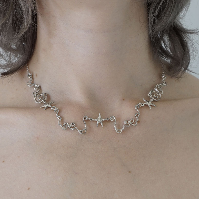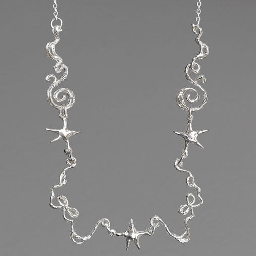 Hand carved organic necklace representing stars, ribbons and spirals finished of with chain. The length is 13"-17"/35cm-45cm.