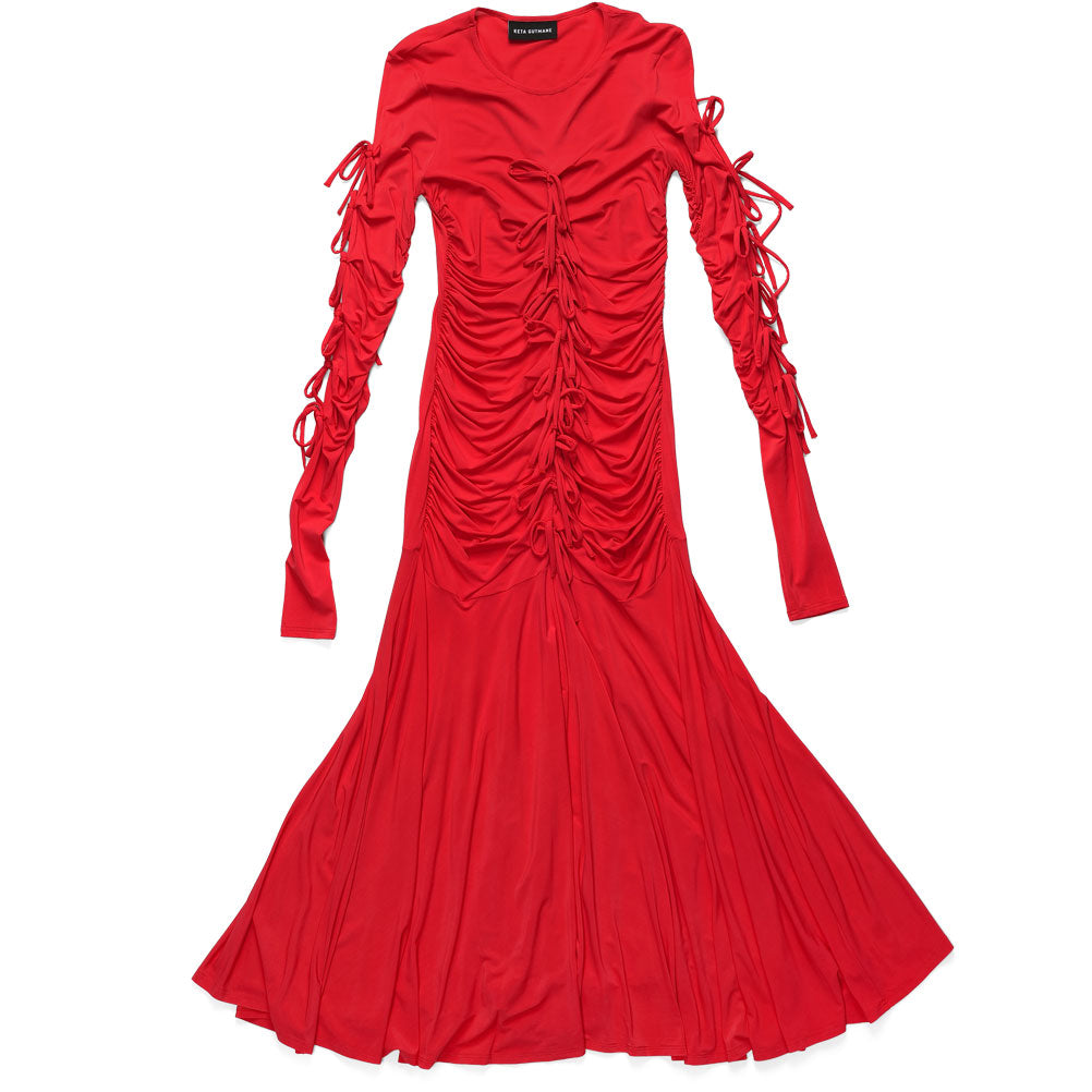 This dazzling red viscose jersey dress is adorned with delicate bow accents, cut to a mid-length silhouette, and finished with a softly flared half-circle skirt.