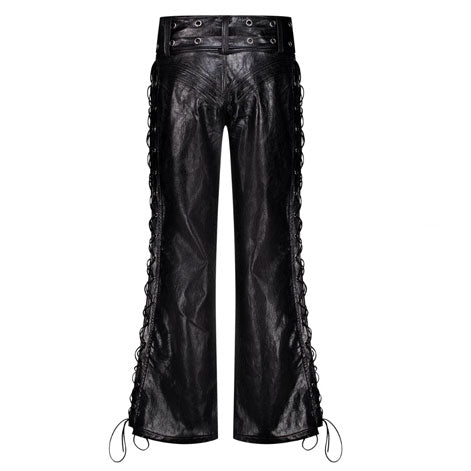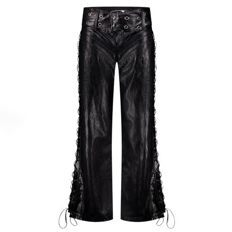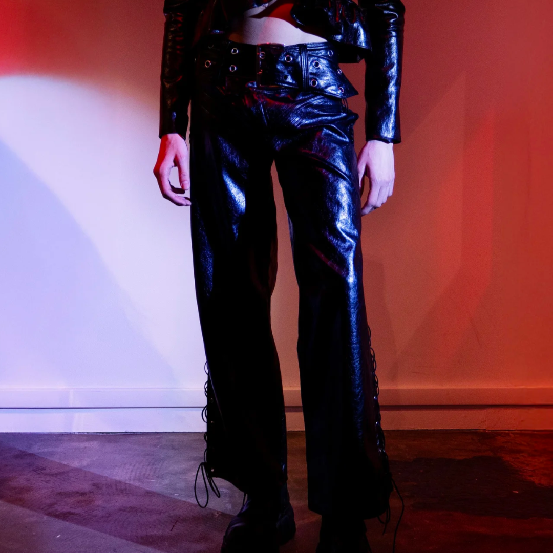 Black imitation leather pants. Lacing / eyelets on pant sides (symmetrical). Button/buttonhole/middle front fly. Geometric cut-outs, topstitched front and back. Integrated belt with eyelets and 9 cm diameter buckle. No pockets. No lining. Yellow label, inside middle back