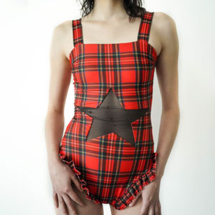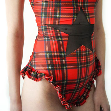 One-piece swimsuit in red lycra tartan, with star-shaped inlay on center front. Transparent black lycra inlay. Straps, frills/pleats on sides of swimsuit. Red lycra lining. Yellow brand label inside center back.