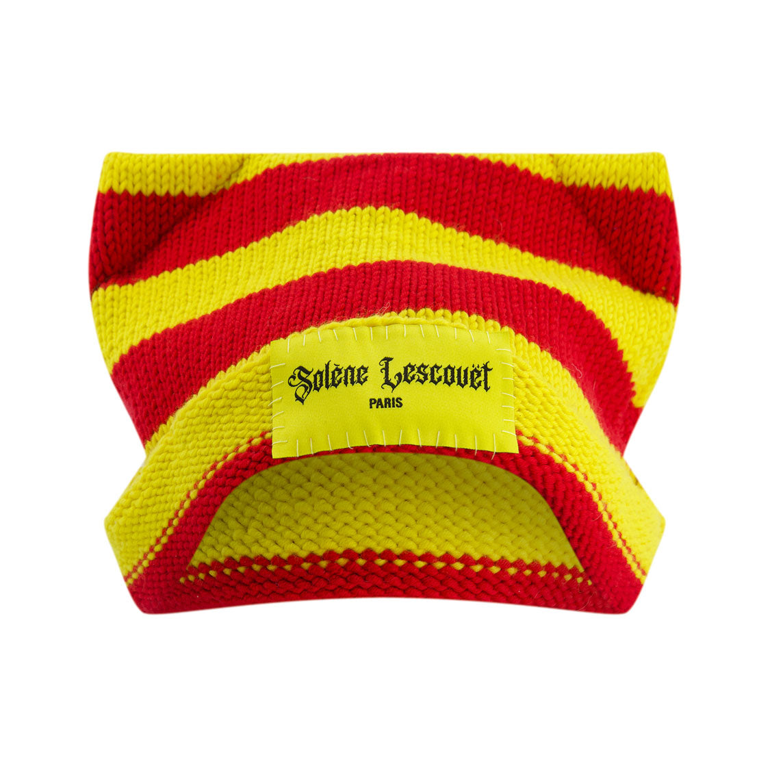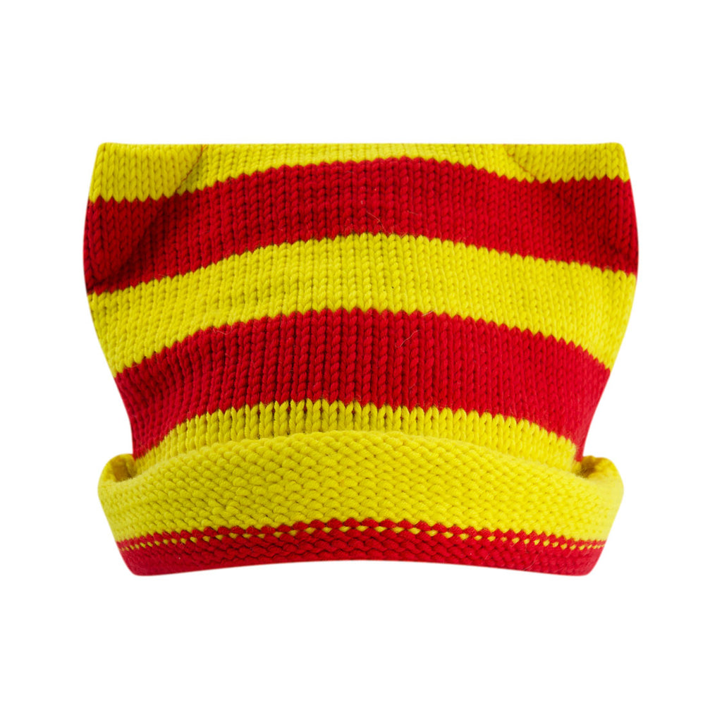 Yellow and red striped hat. With small ears. Yellow label on outside (visible on front).