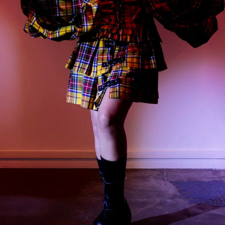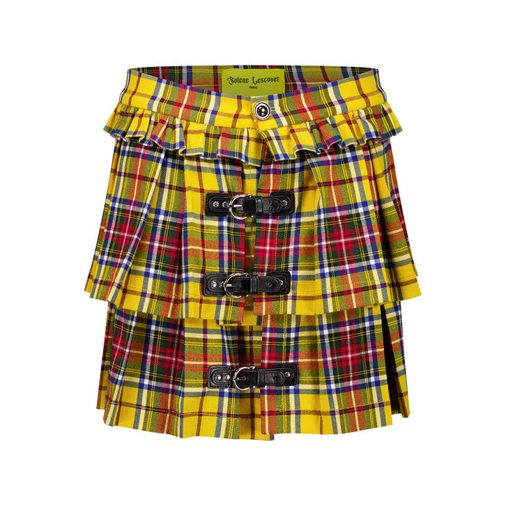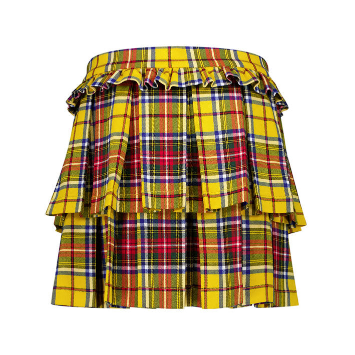 Yellow tartan kilt, ruffled / pleated. Button/buttonhole on top of garment.