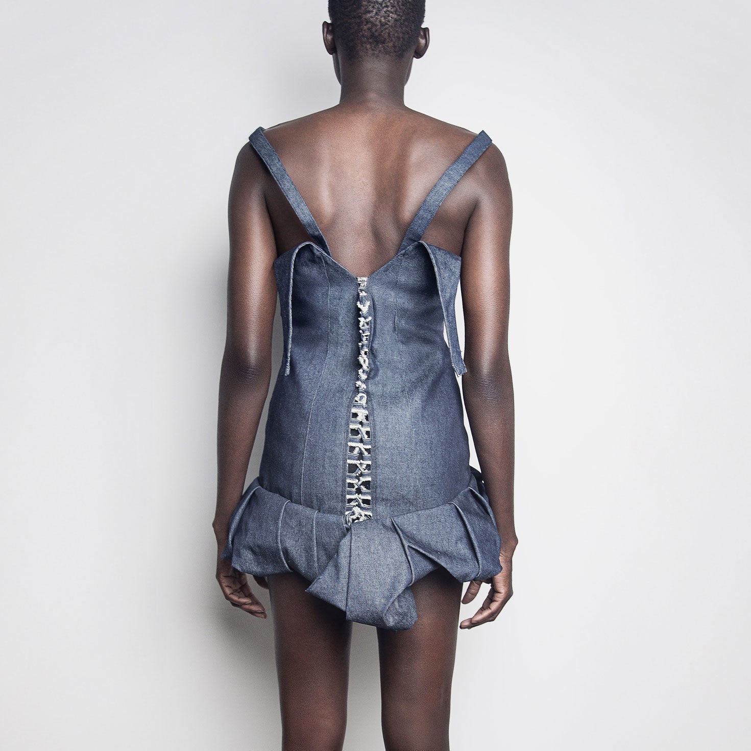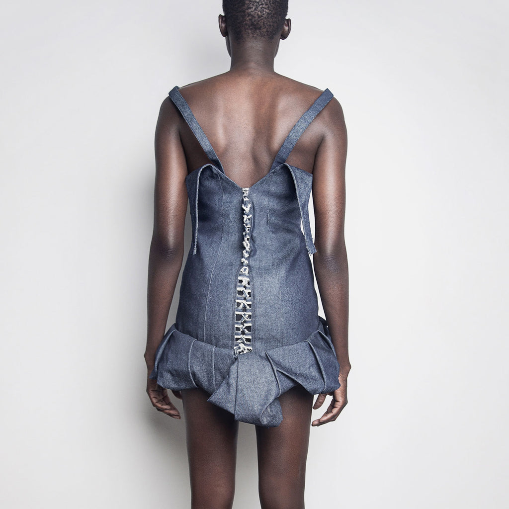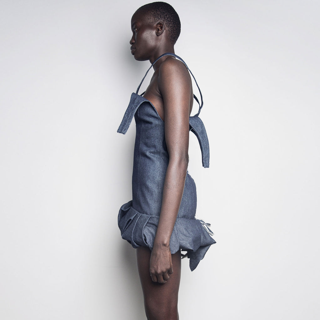Handmade mini gown in dead stock raw blue denim.
