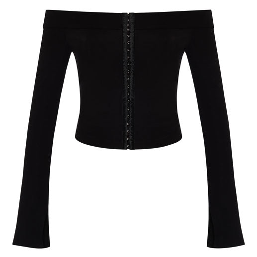 Off-shoulder crop top featuring a distinctive hook-and-eye closure and long fitted sleeves.