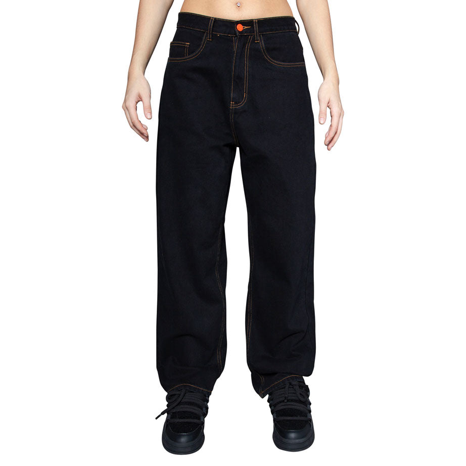 Black denim with a super loose fit in 100% cotton and tabacco stitching.