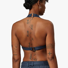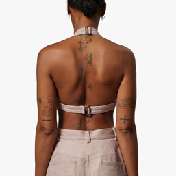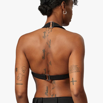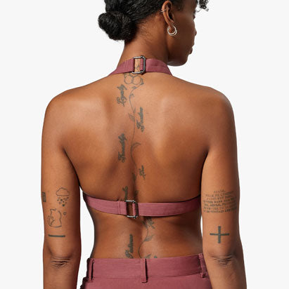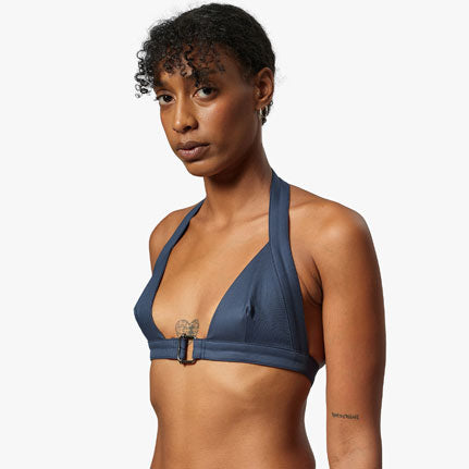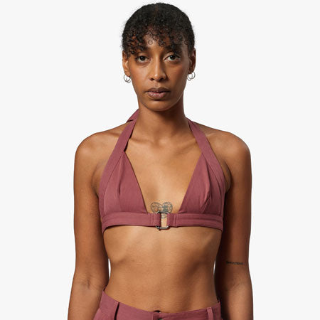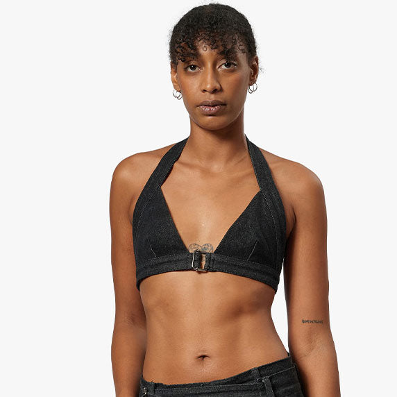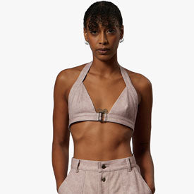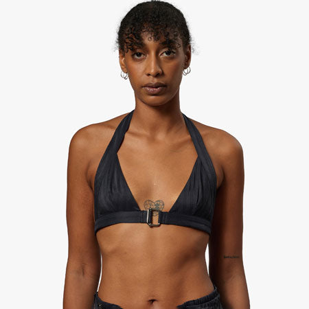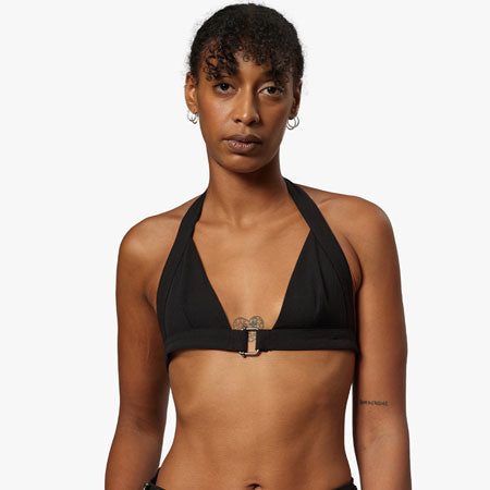 Halter bra with triangle cups and center front metal buckle. Adjustable back strap.