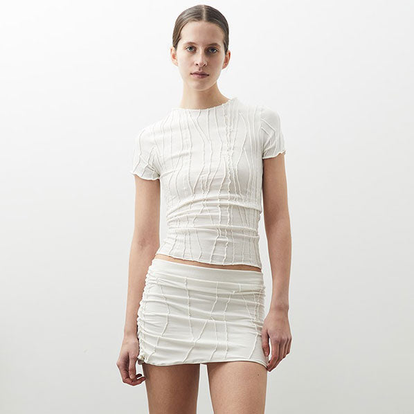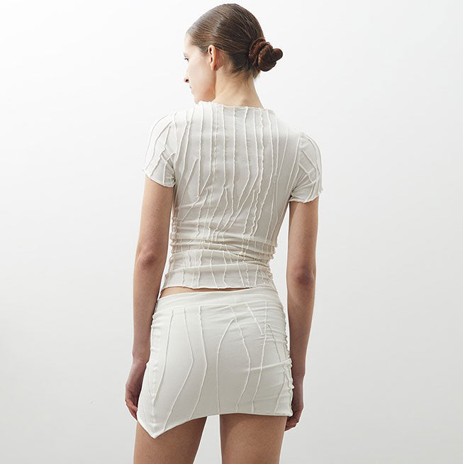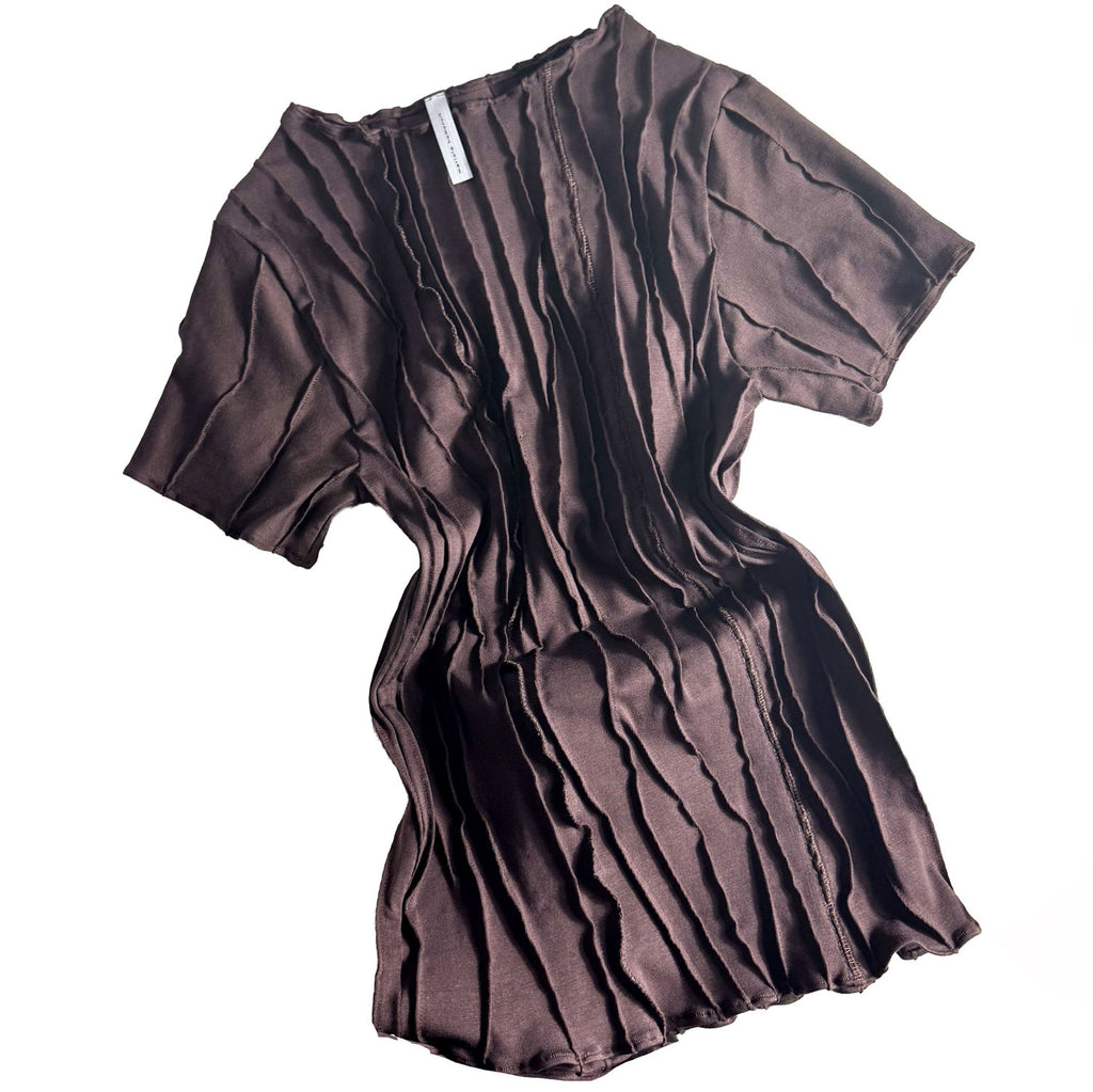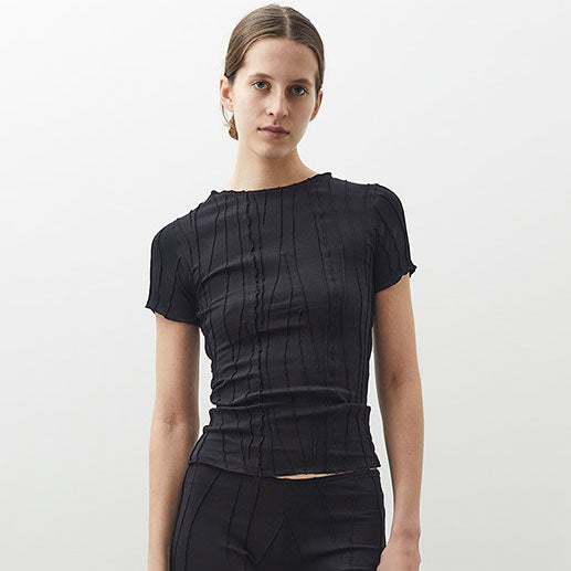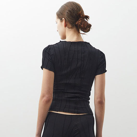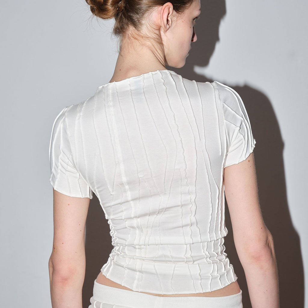 Classy Short Sleeve Top in three iconic colours organic cotton fabric.. This top has a tight fit with a shallow neck line. It is made from a soft fabric using also the fabric scraps and 'cut-offs' of production. Unique handmade suture formation on each item. Finished garments may vary due to artisanal manufacturing.