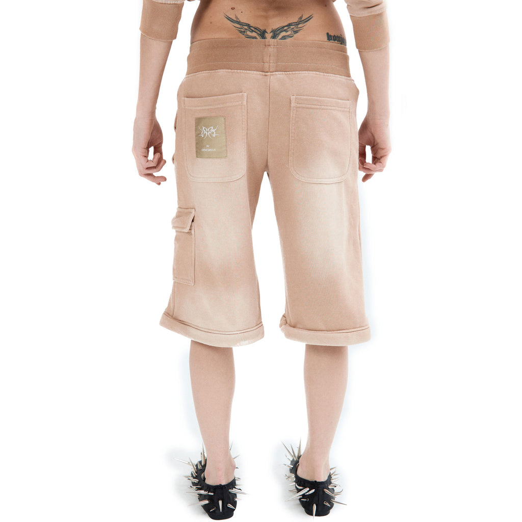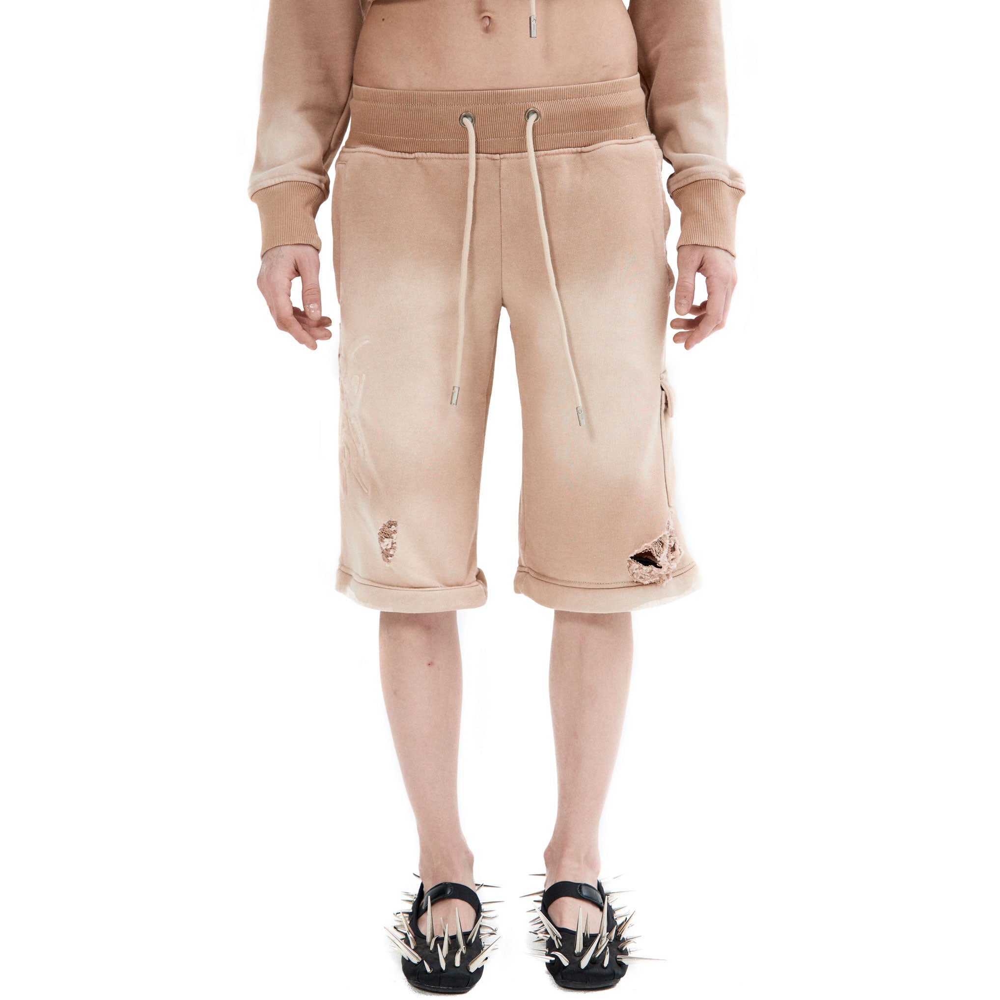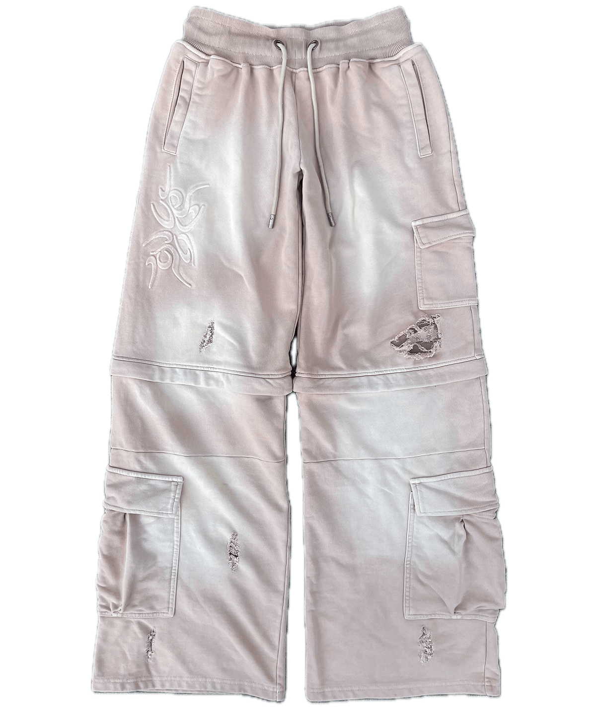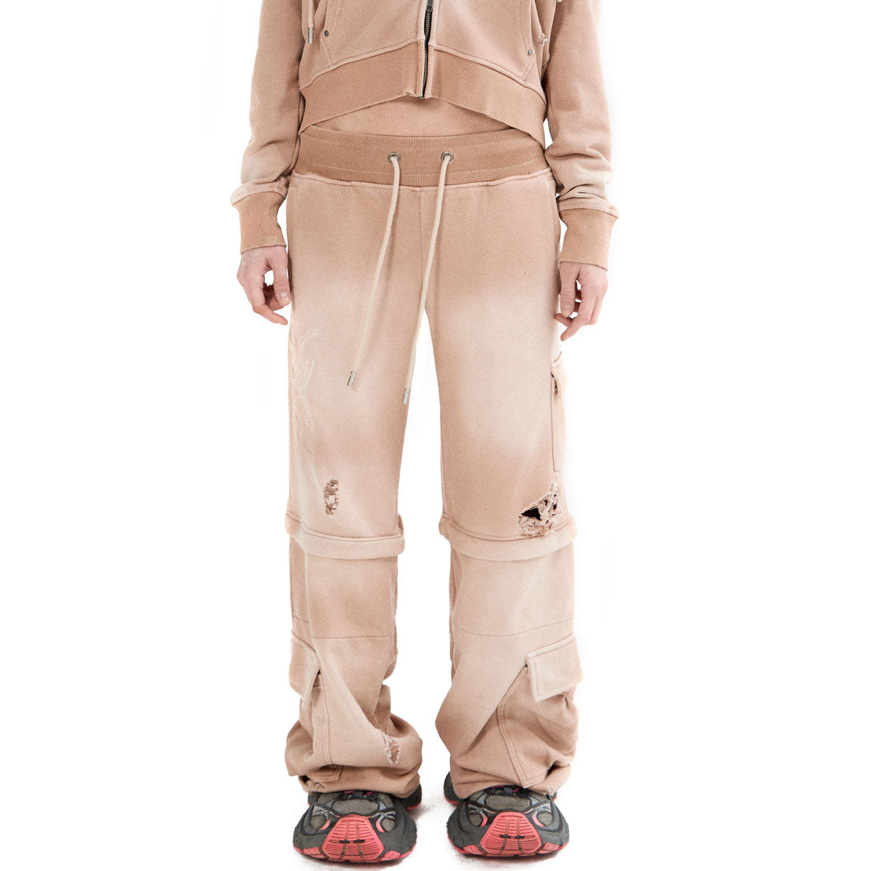 Sporty sweatpants with a low waist design, can be transformed into a shorts, branded aglets, 7 pockets, washed effect, distressed throughout.