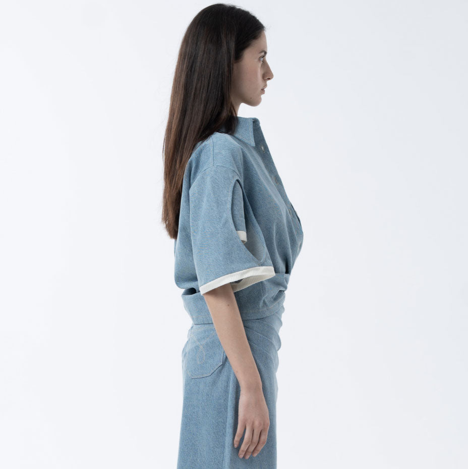 Details: Oversize shirt. Cotton denim. Double sleeve underneath. Upper sleeve cut-out detail. Ribbed cotton detail on sleeves