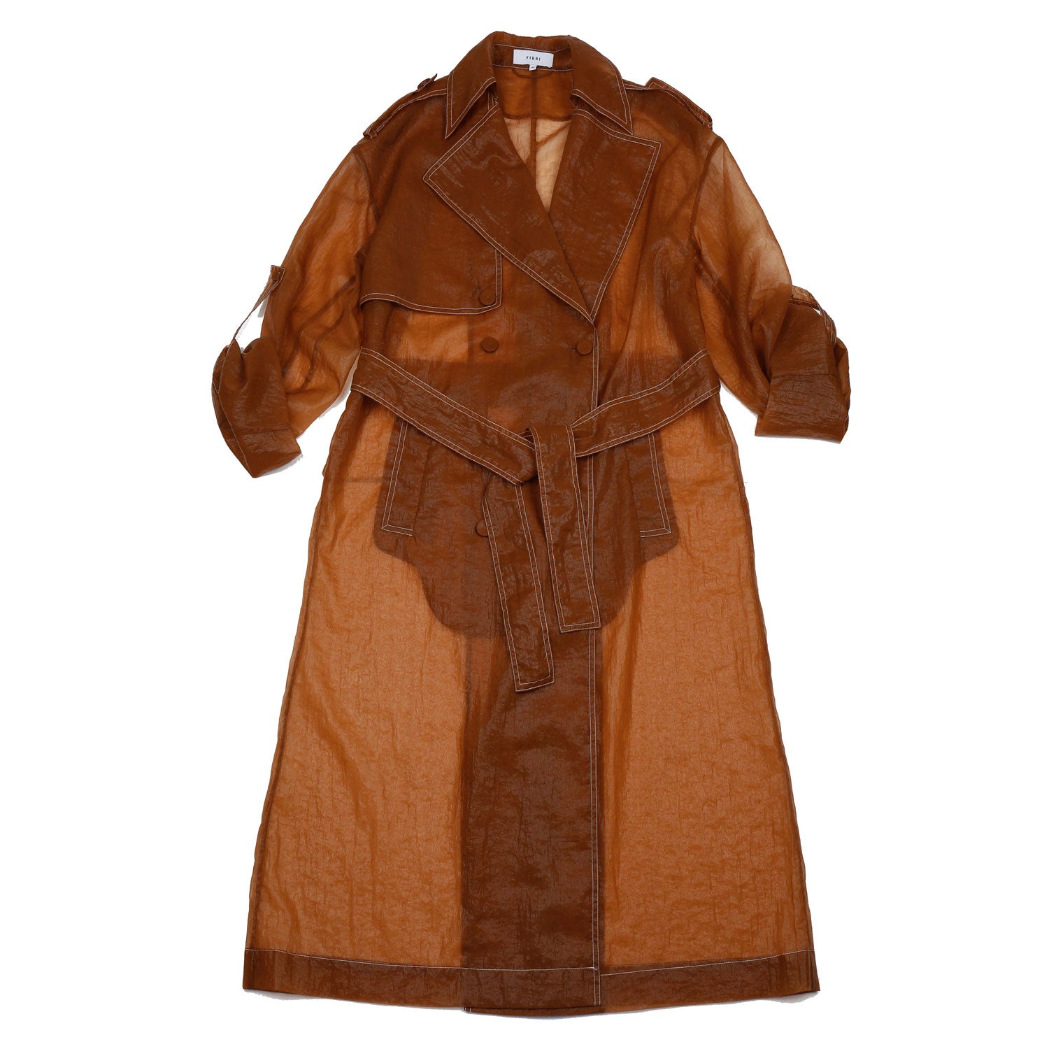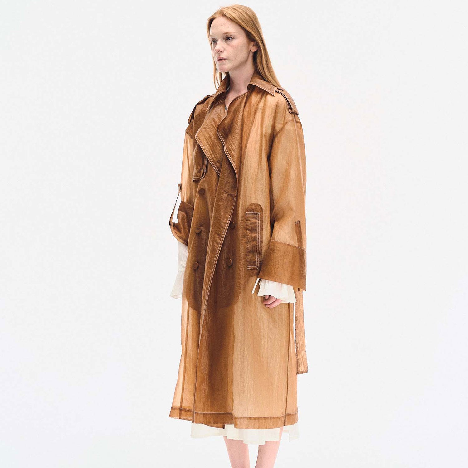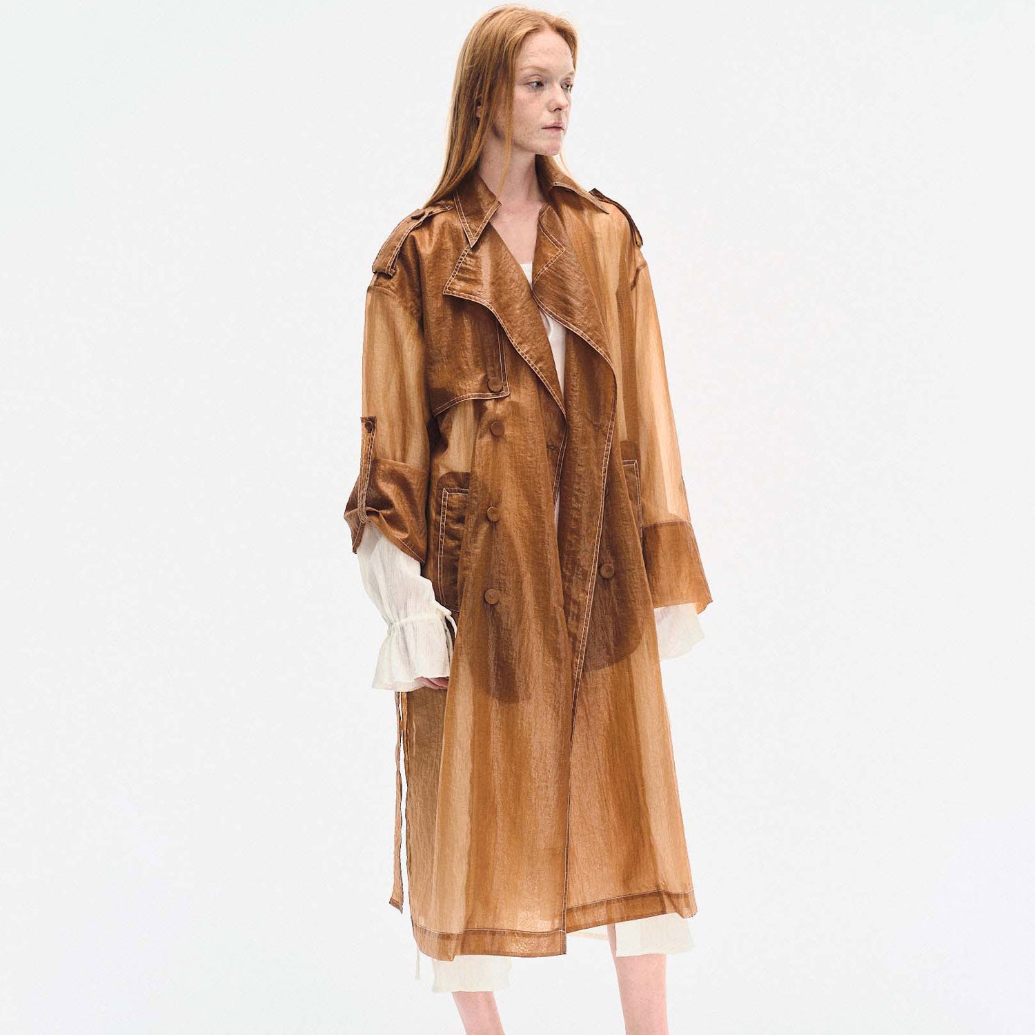 Crafted from lightweight sheer nylon, this long trench coat features a classic double-breasted silhouette with exaggerated lapels, flap pockets, and a belted waist. The translucent finish adds modern edge, while storm flaps and shoulder epaulettes retain timeless trench elements.