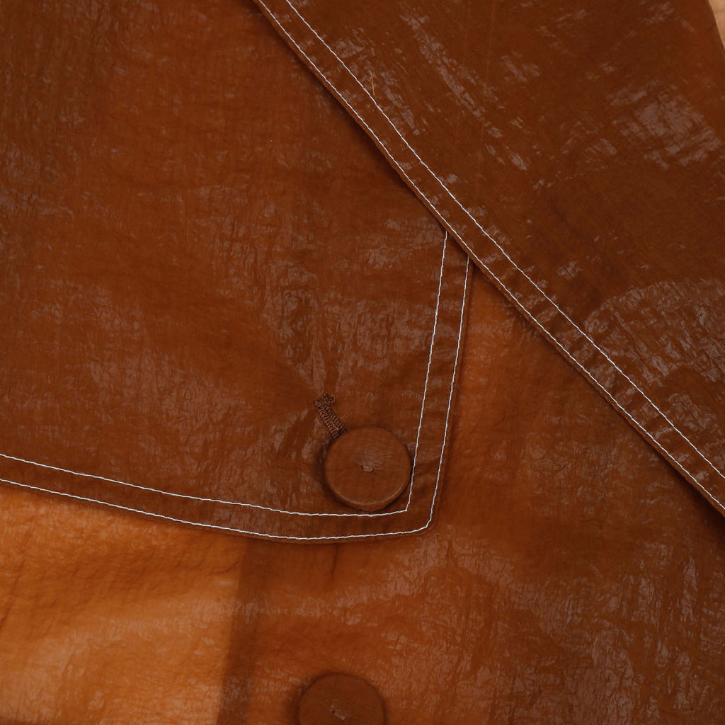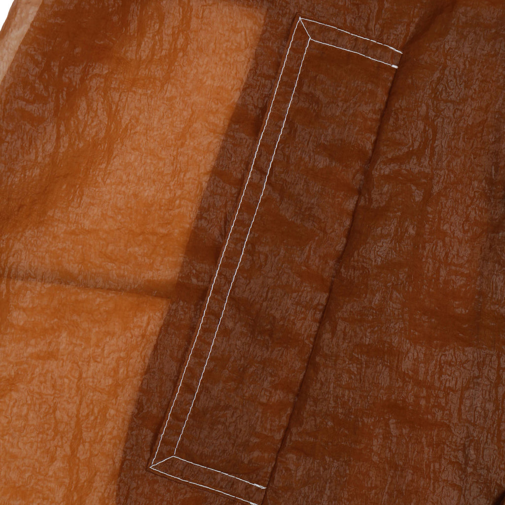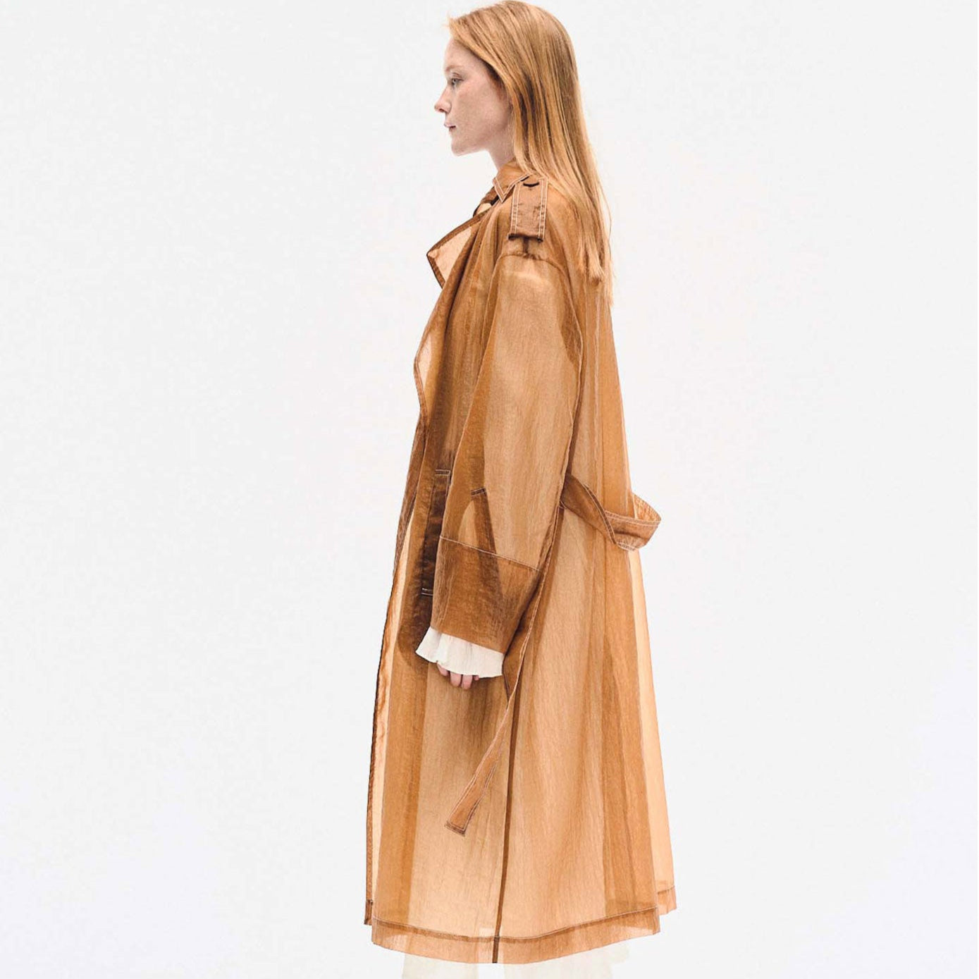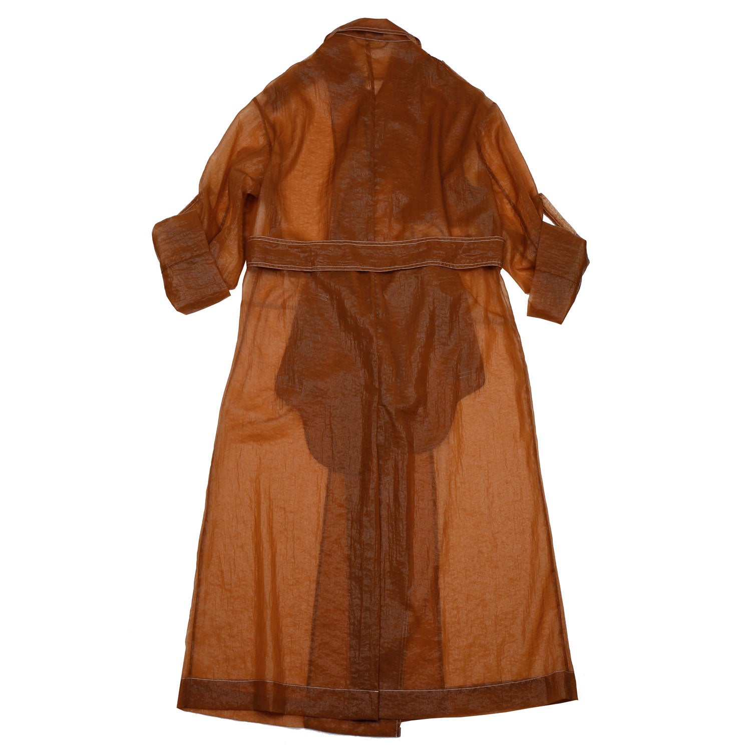Crafted from lightweight sheer nylon, this long trench coat features a classic double-breasted silhouette with exaggerated lapels, flap pockets, and a belted waist. The translucent finish adds modern edge, while storm flaps and shoulder epaulettes retain timeless trench elements.