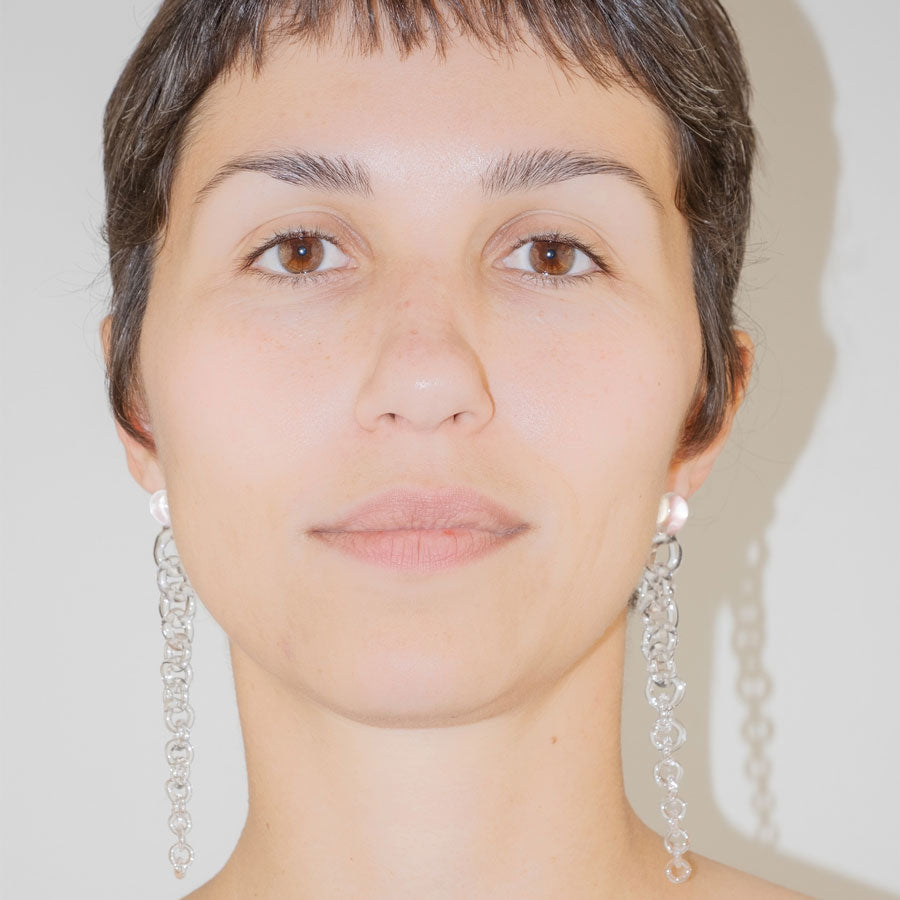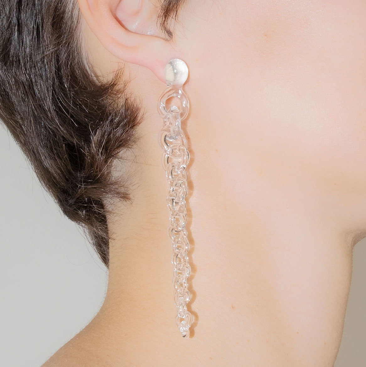 The Tapered Drop Earrings are handmade from solid borosilicate glass. Each earring features a chain-like glass element that gradually tapers from thick links at the top to finer links at the base, creating a sense of movement and distance. At the very top, a small orb-like glass form sits directly above the stud. The earrings are mounted on sterling silver studs for secure wear and are assembled using traditional lamp working techniques.