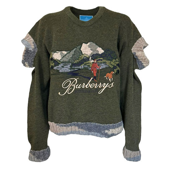100% wool blend round neck sweater. Burberrys embroidery on the front. Clean back. Opening on the shoulders, contrast knitted details as hem. One of a kind.