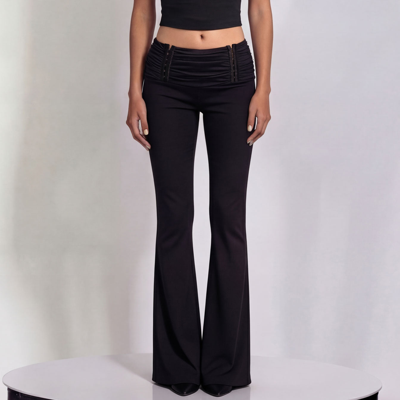 Keep It On Pants contour the body with their flexible structure, creating a strong and balanced silhouette through a subtly flared leg. The draped detail and hook-and-eye closures at the front waist add movement and edge, while the adjustable closures allow you to customize the look.