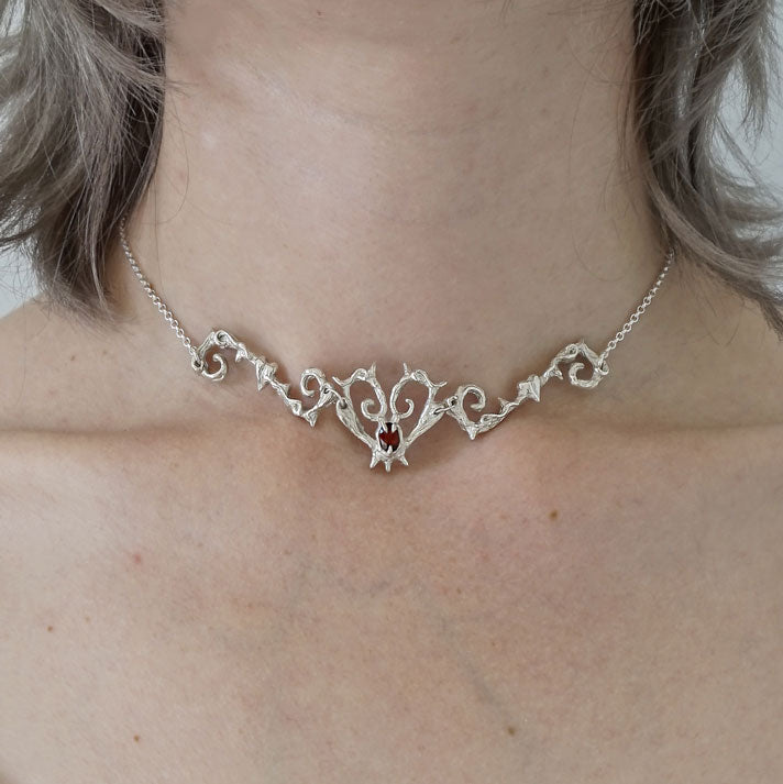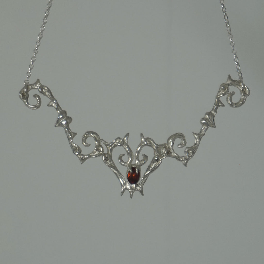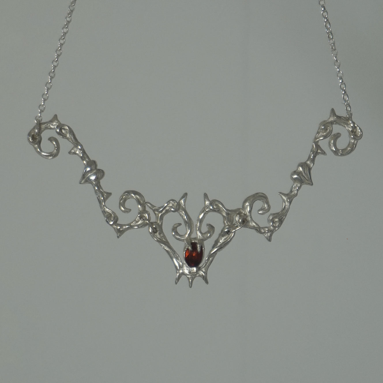Hand carved organic necklace representing a spiky heart with a garnet stone and thorned spirals with a heart in the middle. The necklace is 13"-17"/35cm-45cm long and finished of with chain.