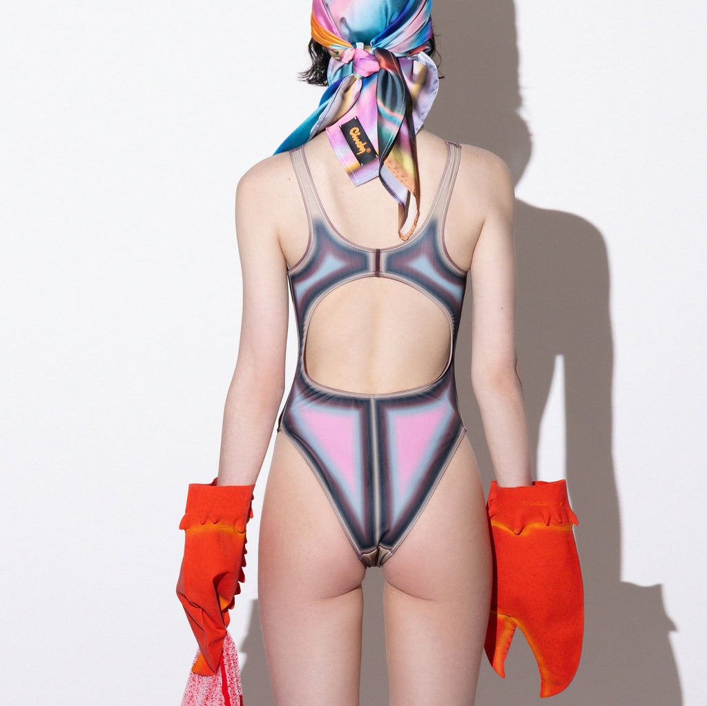 Custom all-over print, crafted in Prague. Sportswear-inspired cut with scoop neck, fixed straps, back cutout, high-cut leg, and full lining.
