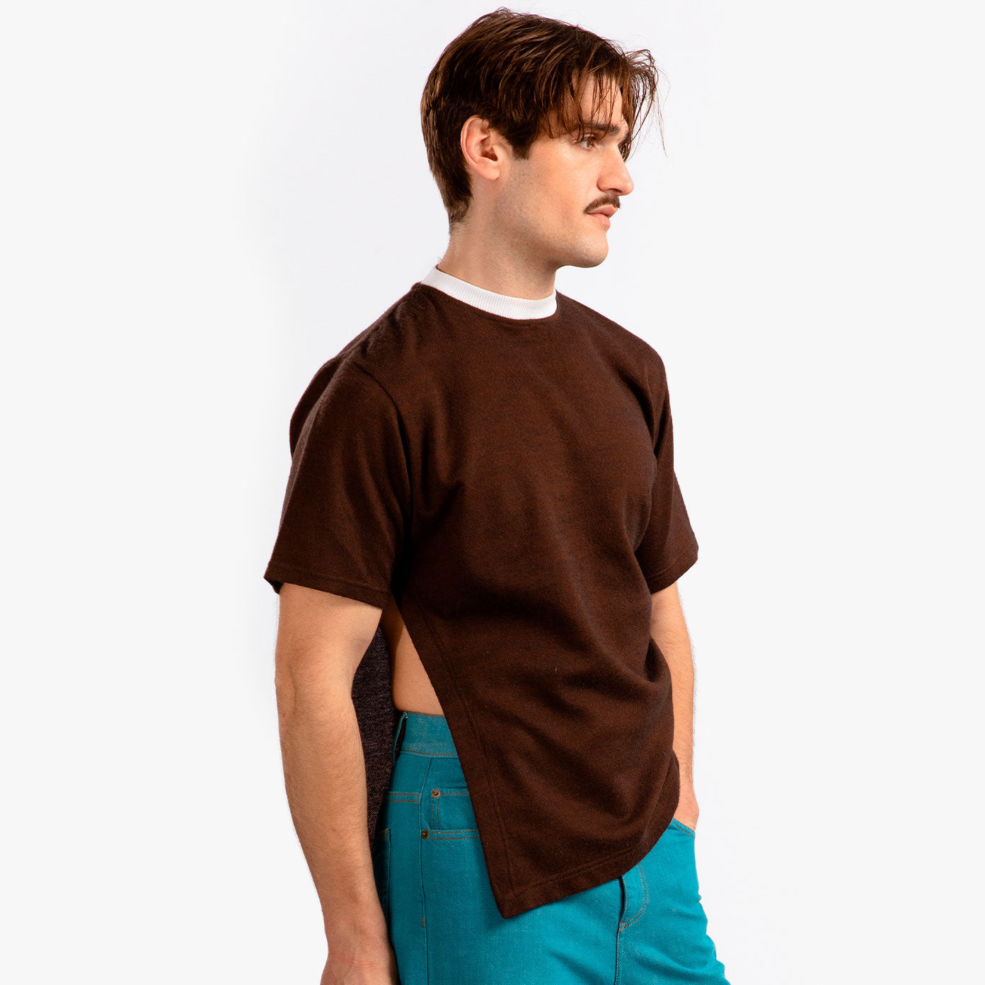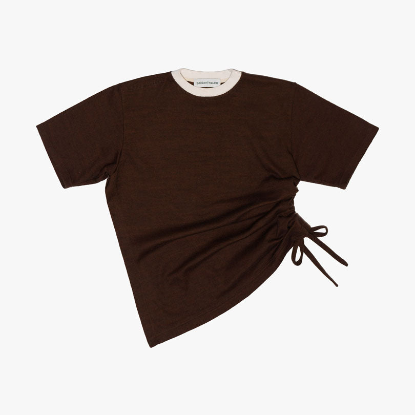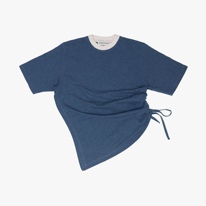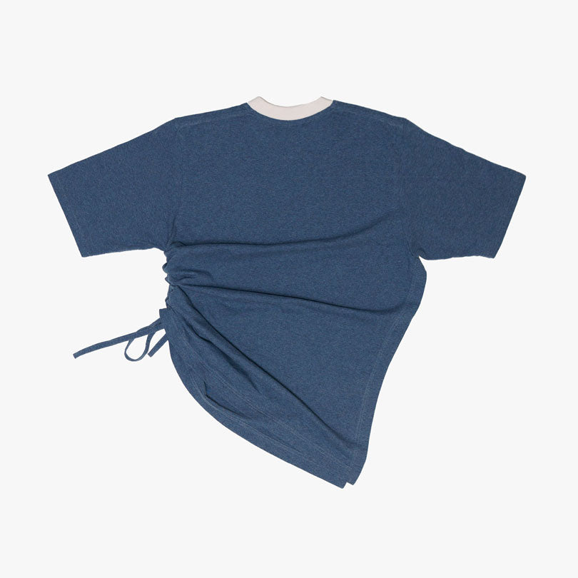 Asymmetrical t-shirt, tight fit with modular side ruching and flank opening in sea blue and dark brown melange cotton jersey.