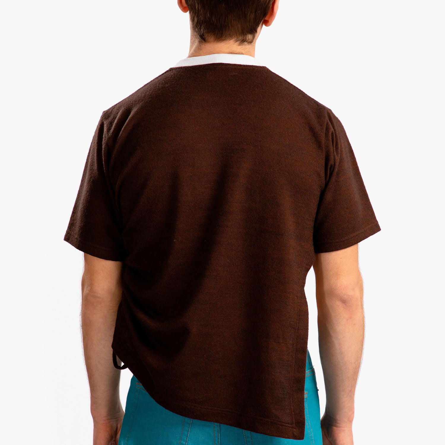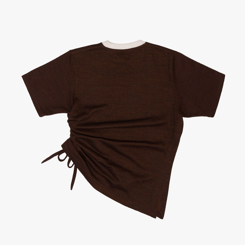 Features: Side (left) drawstrings with multiple hidden loop for adjustable drape. Side (right) slit from underarm to hem. White rib detail at collar.