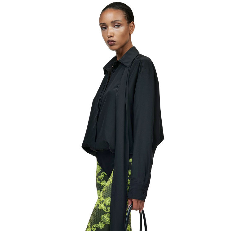Silk crepe blouse featuring an integrated scarf and attached bodysuit base to ensure a perfectly sleek fit — never slipping out of skirts or trousers.