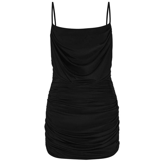 Merging femininity with playful charm, this mini dress is defined by its draped design and body-hugging jersey fabric that flatters the silhouette. Delicate thin straps add elegance, while the mini cut brings a modern and alluring edge. A vibrant yet sophisticated piece designed to stand out from city nights to evening occasions.