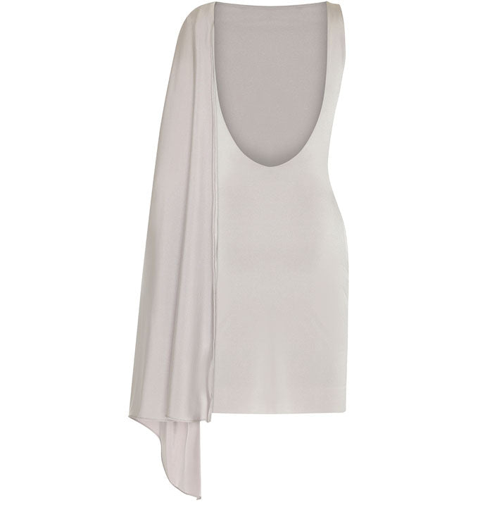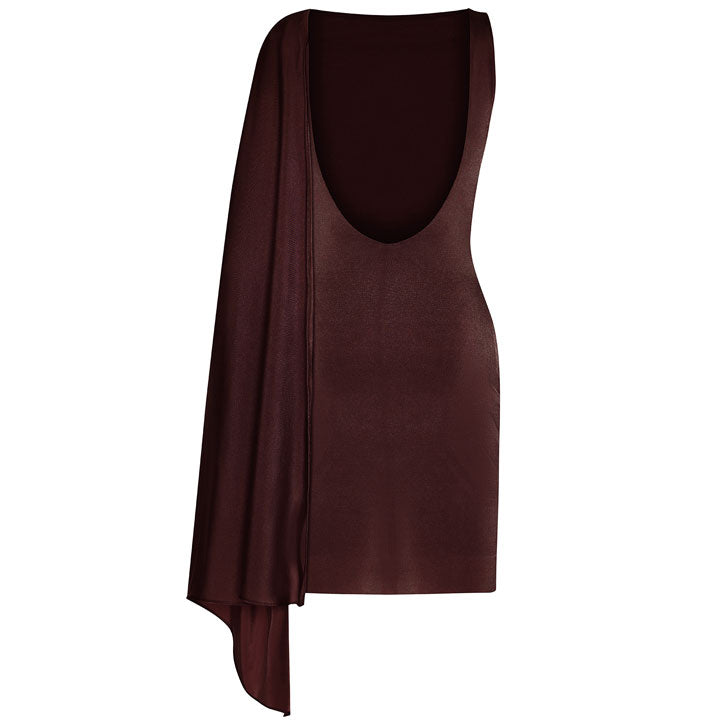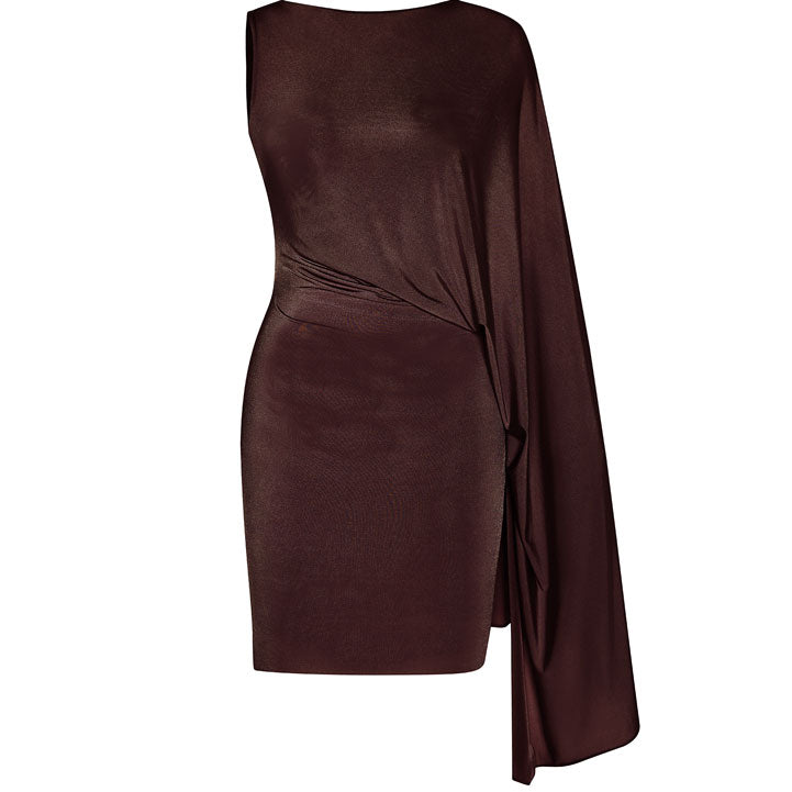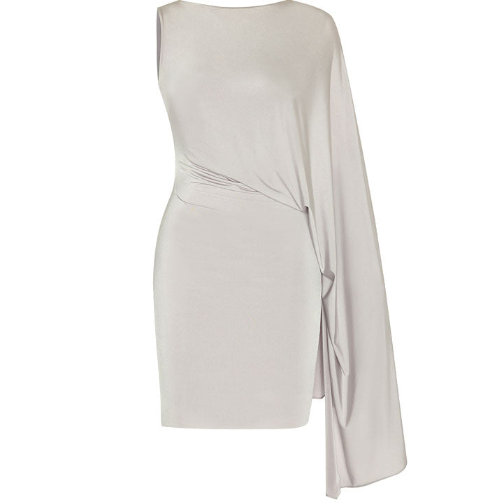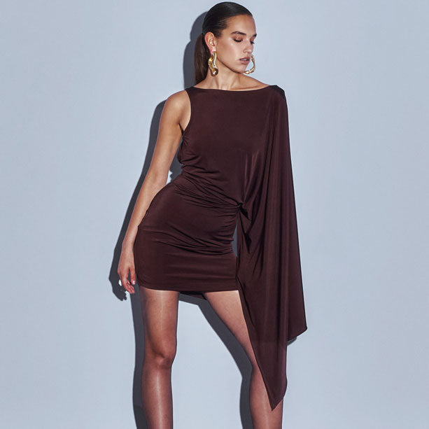 Interpreting modern femininity with bold refinement, this mini dress features a dramatic one-shoulder cape that elevates the silhouette. The body-hugging jersey fabric enhances the feminine form, while the flowing cape adds a sophisticated sense of movement. Our Walk Away Dress embodies both confidence and iconic elegance throughout.