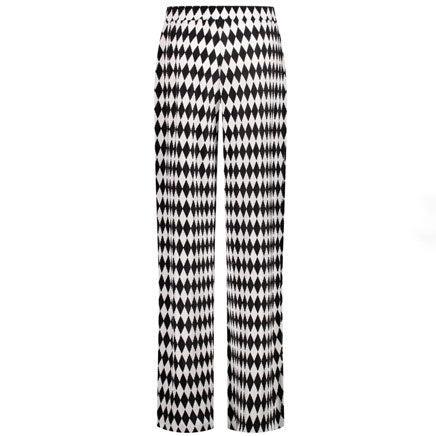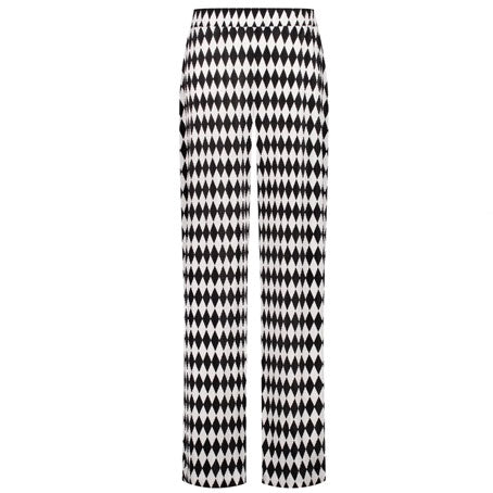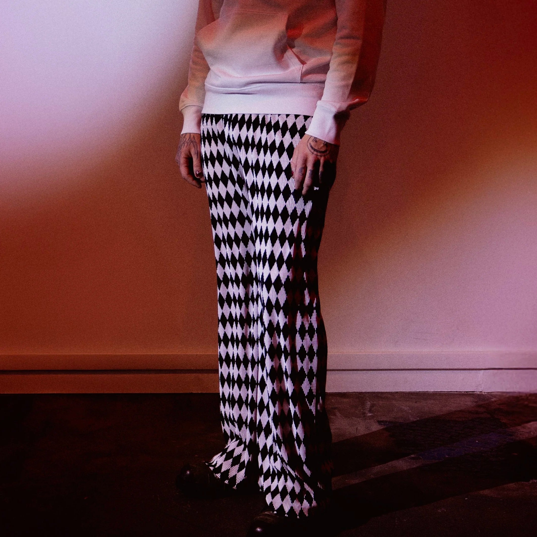 Diamond print pants, black and white. Elastic waistband. No zipper or fly. No pockets. No lining. Yellow label, inside middle back.
